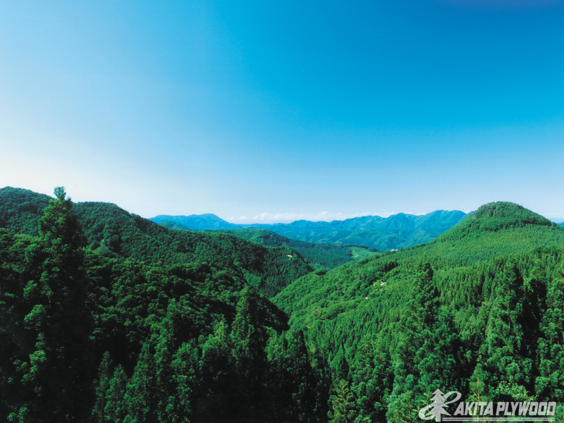 間伐・植林材から合板を製造し住宅部材として使用。製造過程で発生する端材や木芯、廃木材でパーティクルボード(PB)やMDF(中質繊維版)を製造し家具やシステムキッチンに使用。(木質資源の100%利用)。