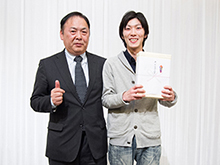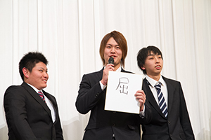 向浜第一工場 石黒さん(左)続いて4月に入社した新入社員がステージに上がり、今年1年を振り返る漢字一文字を、所属する事業所ごとに色紙に書いてもらいました。厳正なる?選考の結果、第一位は森林事業部の「屈」に決定!