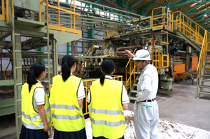 まずは向浜第一工場ホールで、当社の概要や取り組み、日本の森林資源などについての説明がなされ、さらに会社案内DVDによって当社について理解を深めてもらいました。工場を見学する際の注意事項を伝えた後に、9グループに分かれて工場へと向かいました。