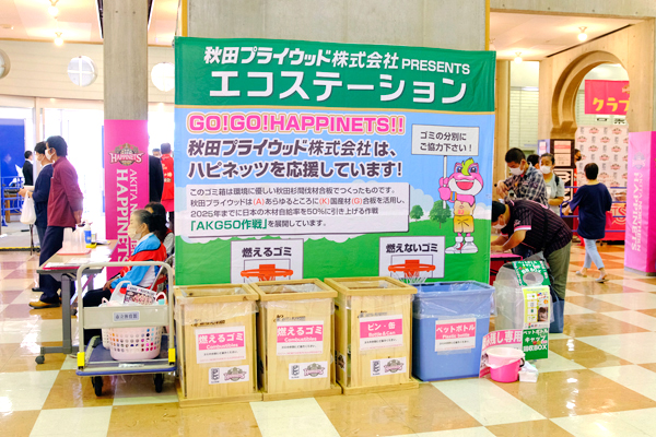 セカンダリーシャツでシュートタッチを確認 会場には、ゴミ分別を呼びかける秋田杉間伐材合板を活用したゴミ回収BOX「エコステーション」が設置されています。両チームのブースターがゴミのない美しい会場で勝利への応援に専念できる空間づくりに貢献しています。