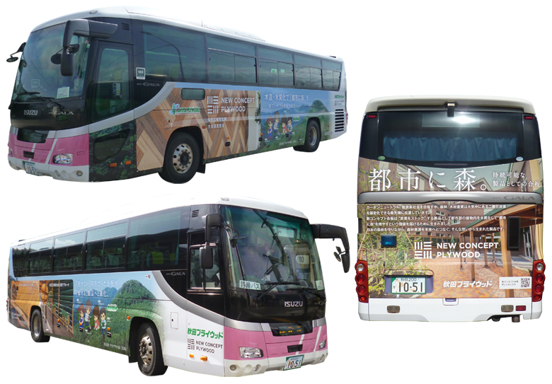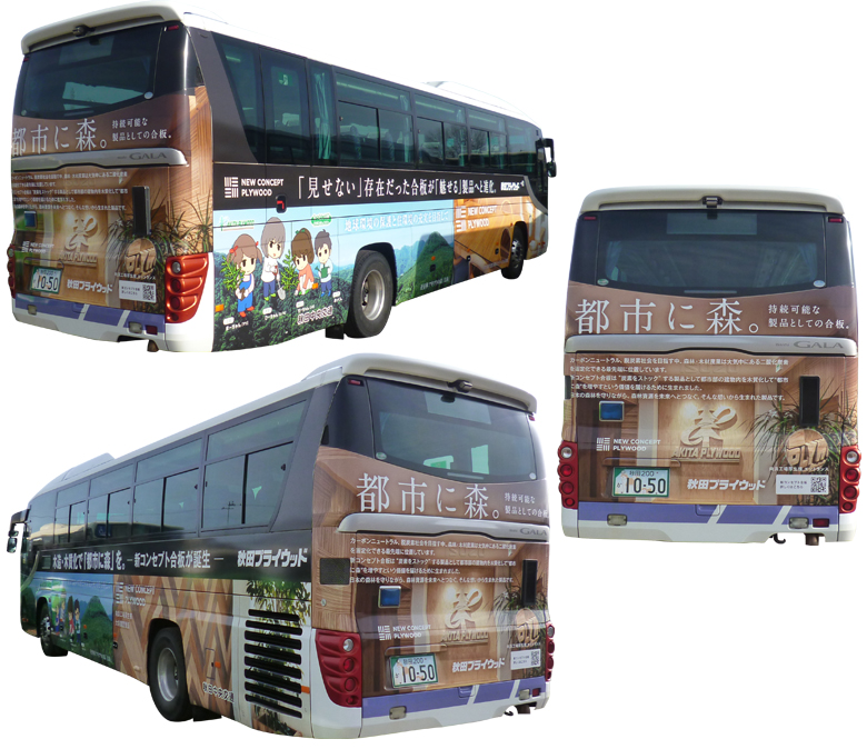 秋田プライウッドは今後も企業理念である「地球環境の保護と住環境の充実を目指して」、日本の森林の再生と地域社会へ貢献してまいります。地域に密着した広告としてのバスラッピング広告を通じて、地元企業として秋田を盛り上げるべく当社の思いを乗せてバスは走っています。