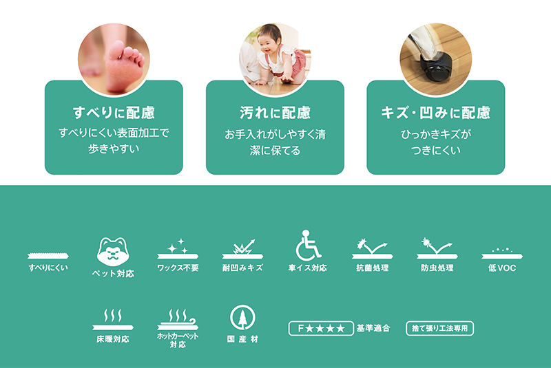 床が滑りやすいと不安定になりやすく、無意識に足に力が入ってしまいます。ネマーレは、子どもから年配の方、誰もが歩きやすい床材を目指しました。