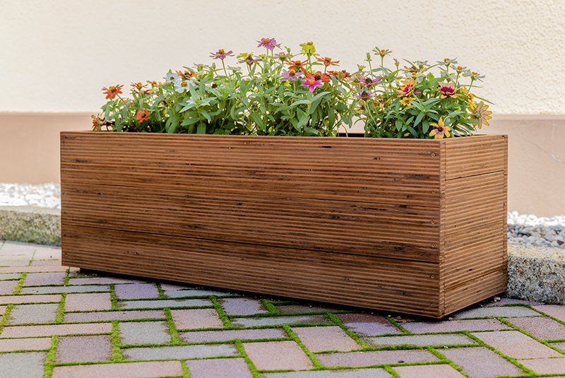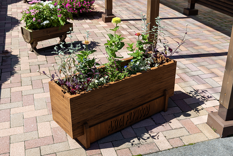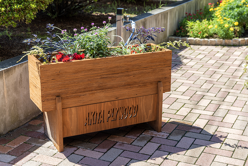 積層面で側面を組み立てて24mm厚の合板を底板とした底板プランター。置台のAKITA PLYWOODの文字はルータでくり抜いて表示。