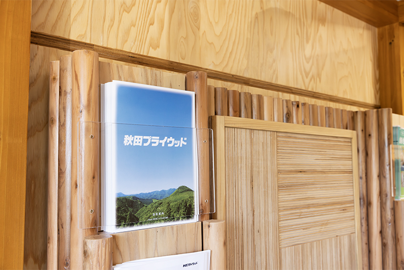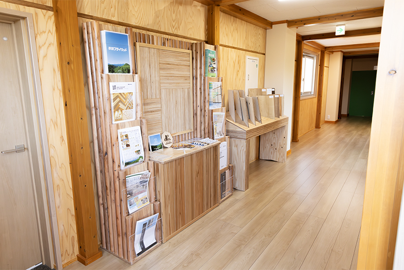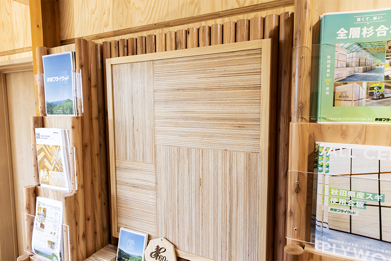 合板の製造過程で最後に残った丸太の芯の部分である「むき芯材」を活用した展示ボード。正面の掲示スペースは積層面、合板カットサンプルなどを置く展示台の腰板には杉小町を使用左右にある5段のパンフレットラックは「むき芯材」で奥行を付けている。