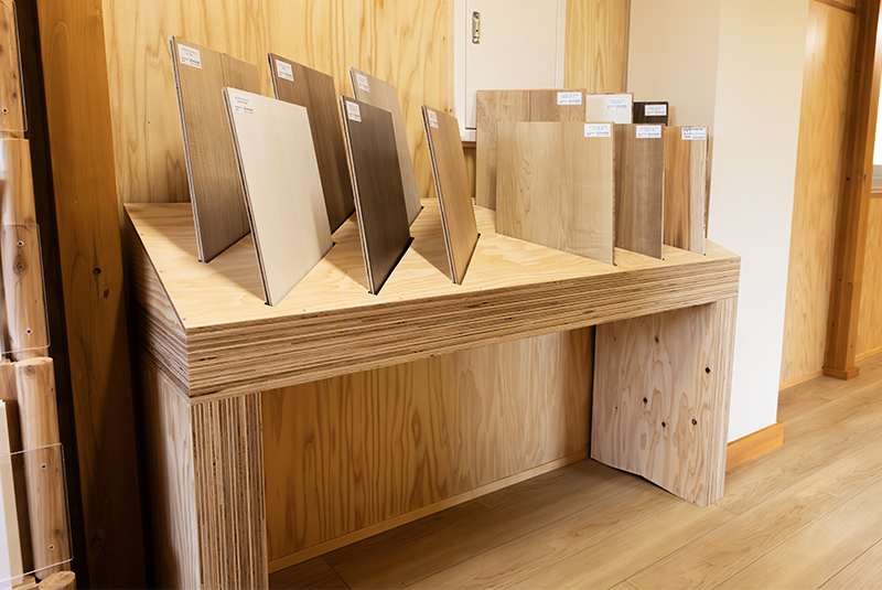 超厚物合板を活用した展示台。合板カットサンプルやフロアーサンプルを差し込んで展示できるよう天板にスリットを施している。
