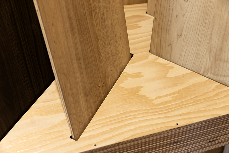 無節の24mm厚合板にナチュラルとチェスナット、マホガニーブラウンの3色の積層面を装飾した展示ボード。無節の板面の美しさと積層面のデザイン性によるコントラストが特長。