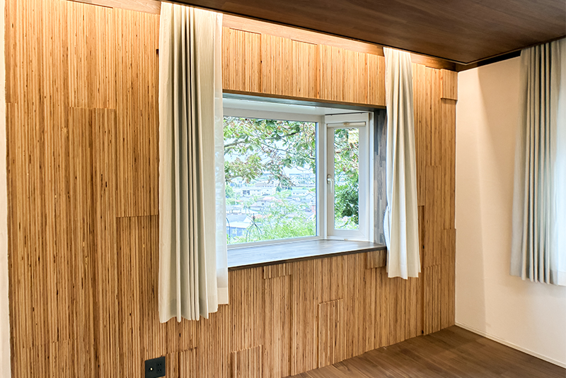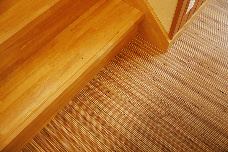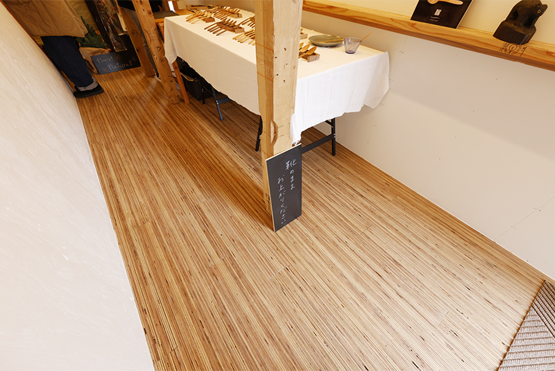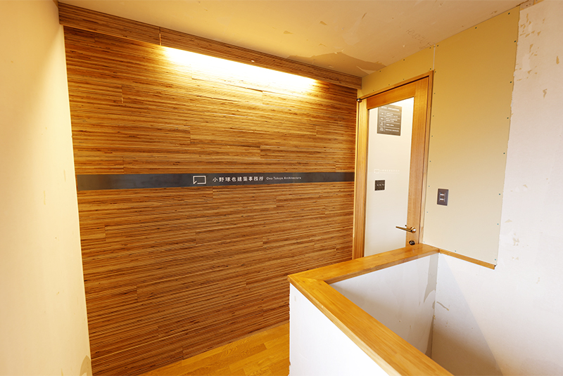 小野琢也建築事務所(秋田県秋田市)の楢山事務所の改修にあたって床や壁に積層面が採用され12mm厚にカットして、サンダー処理によって表面を滑らかに仕上げて納品。