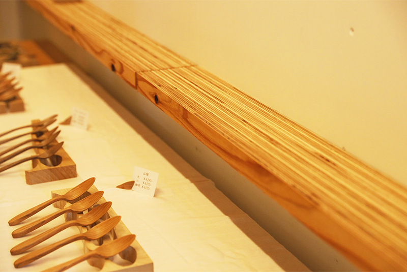 「スギ」「カラマツ」「トドマツ」「ヒノキ」の4つの樹種からなる合板の「端材」で構成。当社住宅事業部でプレカット加工する際に発生する「端材」をつなぎ合わせ天板とした。