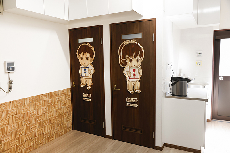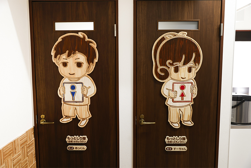 合板をレーザー加工で製作した「合板4きょうだい」キャラクターの「末っ子あっくん」「長女すーちゃん」を男女の扉にそれぞれ配置。床は「すべりにくい」床材「ネマーレ」として、腰壁は超厚合板を市松模様状に配置。