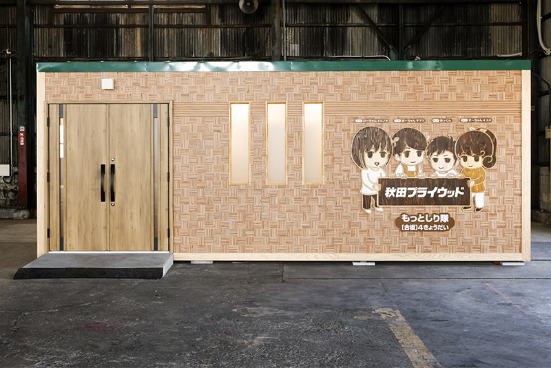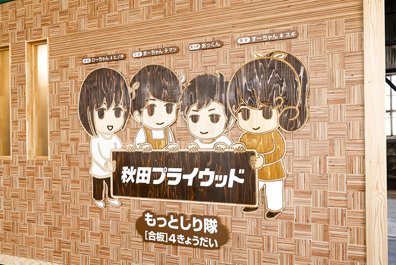 四方の壁を積層面デザインとした書庫。超厚合板を市松模様状に配置、サイズの異なる無節の全層スギ合板の組み合わせ、グリーンのカラーリングとした「ヘリンボーン」柄、奥行きに差をつけて動きのある配置といった積層面デザイン壁の見本となるように施工。正面入口の壁面には合板をレーザー加工で製作した「合板4きょうだい」のキャラクターを配置。