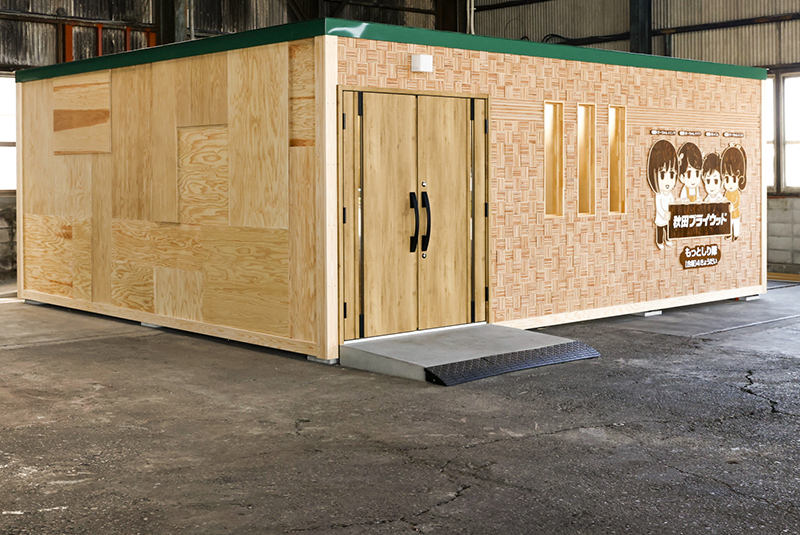 クラブハウスは鉄骨造りの2階建ての延べ床面積1,267平方メートルで、壁や廊下腰壁に当社の「内装材杉小町」、選手用ロッカールームには「秋田杉合板」がなどが使用されており建物内の木質化が図られている。