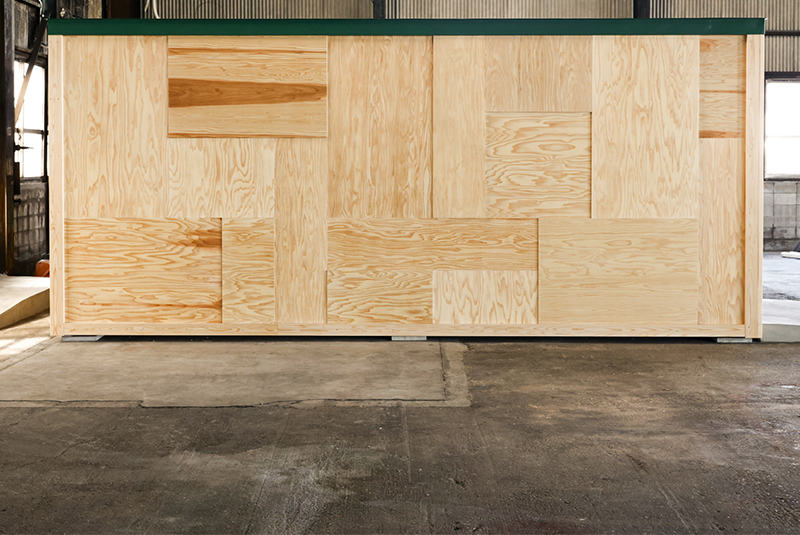 合板機械の設計製作を行う株式会社ウロコマシナリー様(北海道函館市)の七飯工場ホール一部の壁面を積層デザイン壁とコニファーエースで木質化。積層デザイン壁は超厚合板(112mm×112mm)厚さ12mm、15mm、18mmの3種類を市松模様状に配置。床材として使用される「コニファーエース・メープル」を壁面として採用。