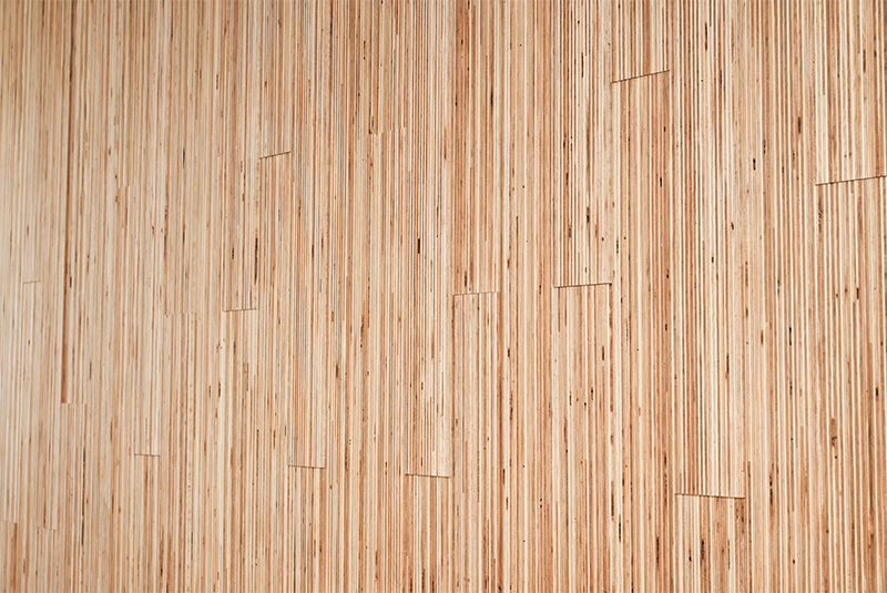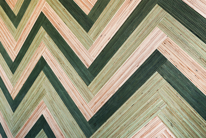 超厚合板の積層面や板面の木目の美しさが目を惹く壁面。積層面に着色、杉の赤身と白身を生かした板面、形状や方向など組み合わせを変えることでデザイン性は無数に広がる。