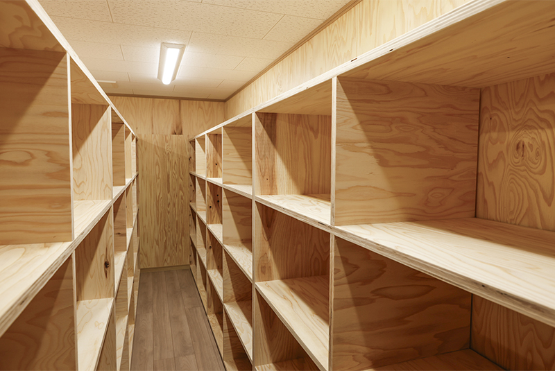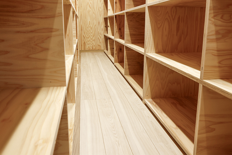 室内は本棚は「ネダノン」で製作し、内壁に「内装材 杉小町」、床材に「ネマーレ」と当社の製品を使用し断熱性、調湿作用に優れた木材の特性を活かした書類の保管が可能に。