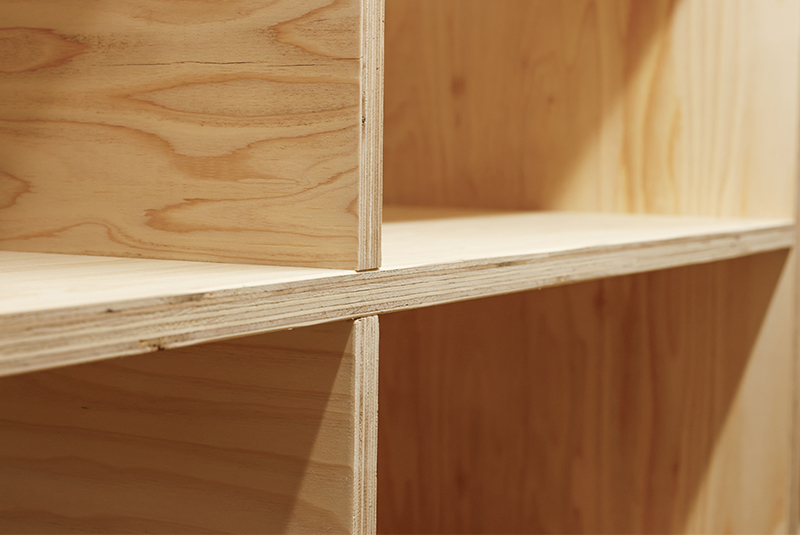 合板の木口の積層面でデザインされた可動式のキャビネット。側板は無節の合板として木目の美しさを際立たせている。
