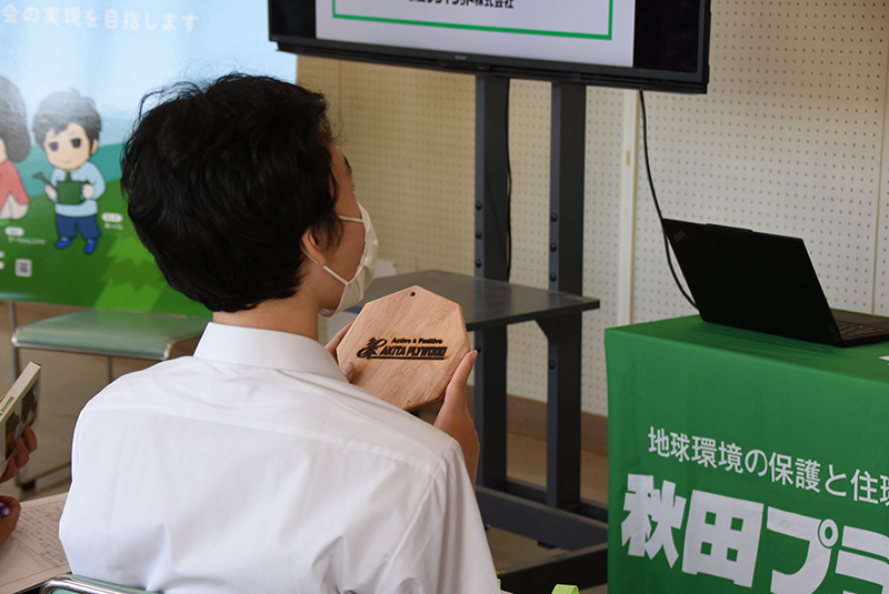 「仕事の楽しさは何ですか」との質問に対しては、合板の製造を通じて地球環境の保護に貢献できる、世界の環境問題の解決に関わることができるという、秋田にいてもスケールの大きな仕事ができることに楽しさとやりがいを感じると応じました。「秋田にはいろいろな種類の企業があることを知った」と感想を述べた生徒もいて、可能性が無限に広がる中学1年生にとって「企業」「社会」「働くこと」などへの意識が芽生える機会となりました。