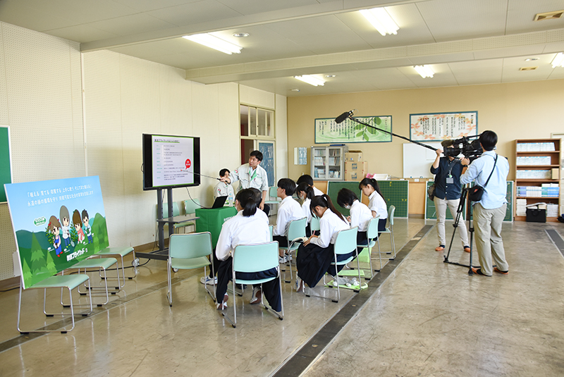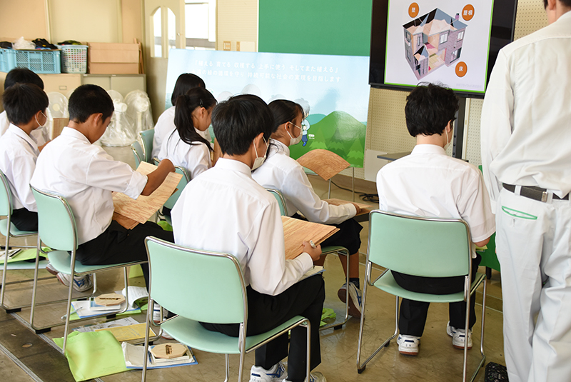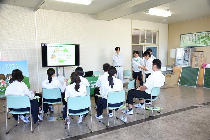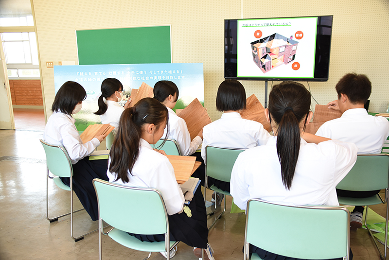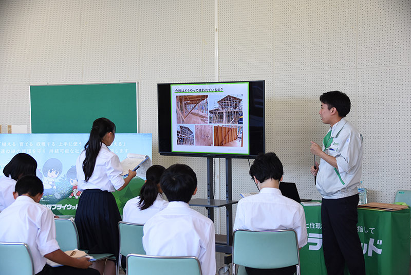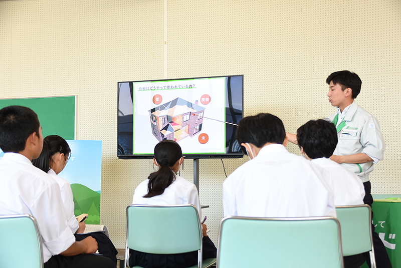 森林資源の循環利用の大切さを説明する際に、「木を伐ることが悪い事か」を問うと挙手する生徒が見られましたが、「木を伐って、使って、植えて、また使う」という森林資源の循環利用を構築して森林による二酸化炭素の吸収を促進することや、合板をはじめとする木材製品の利用により二酸化炭素を固定化することが地球温暖化の防止に貢献できることを説明し、地球に良いことをしている企業であることを強調しました。