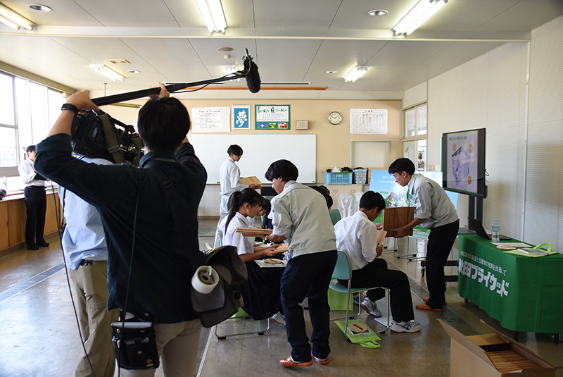 またNHK秋田放送局ニュース番組の取材が1回目の企業訪問時に行われました。カメラやマイクなど撮影機材がある中でも生徒たちは当社社員の説明に耳を傾けてメモを取りながら、合板や当社について学ぶ姿を見せてくれました。