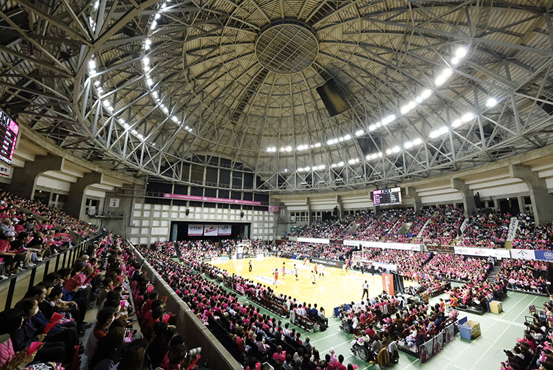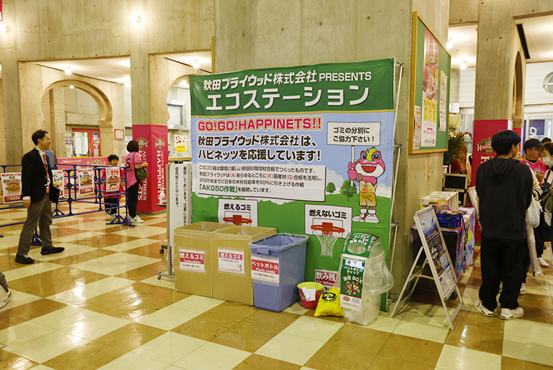 会場にはゴミの分別を呼びかけながら環境美化への意識を高める「エコステーション」が設置されていて、両ブースターが応援に専念できる美しい会場づくりに貢献しています。また観客席の一部には当社の秋田杉間伐材合板が使用されており、アリーナを染めるピンク色と大きな声援でリーグ屈指の空間を作り上げる「クレイジーピンク」秋田ブースターを足元から支えています。