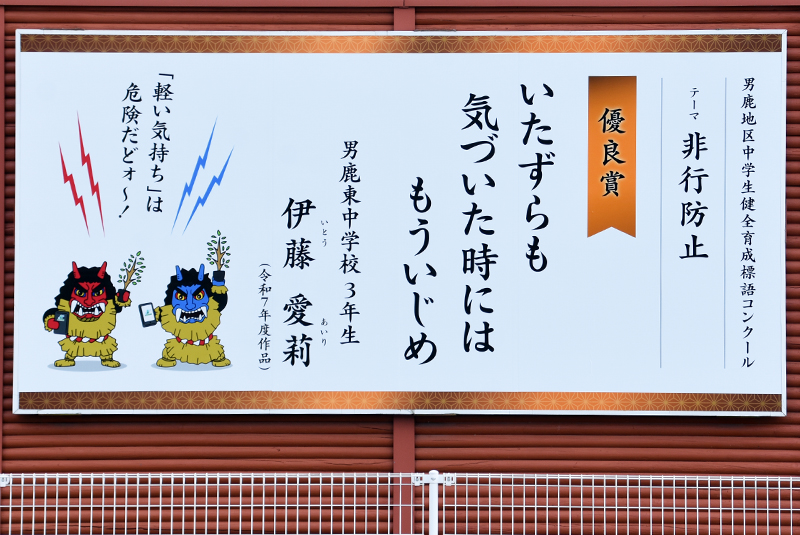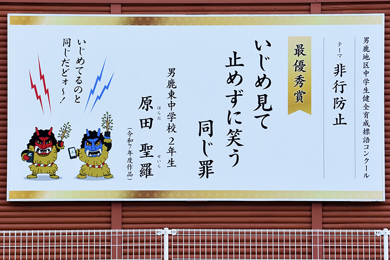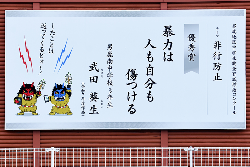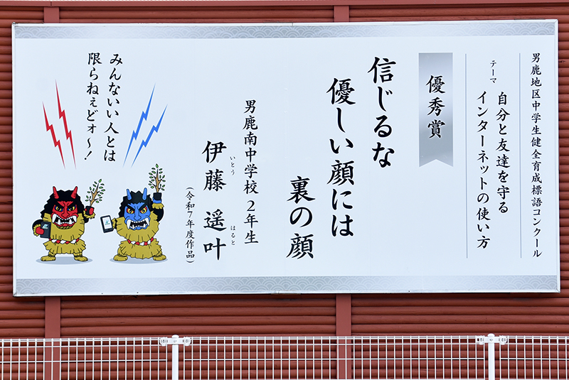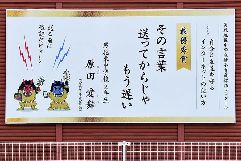 展示作品には生徒たちの標語とともに「なまはげキャラクター」から注意を促す一言メッセージも添えて、危険性に対する意識を地域の方々にも高めてもらえるよう工夫しています。