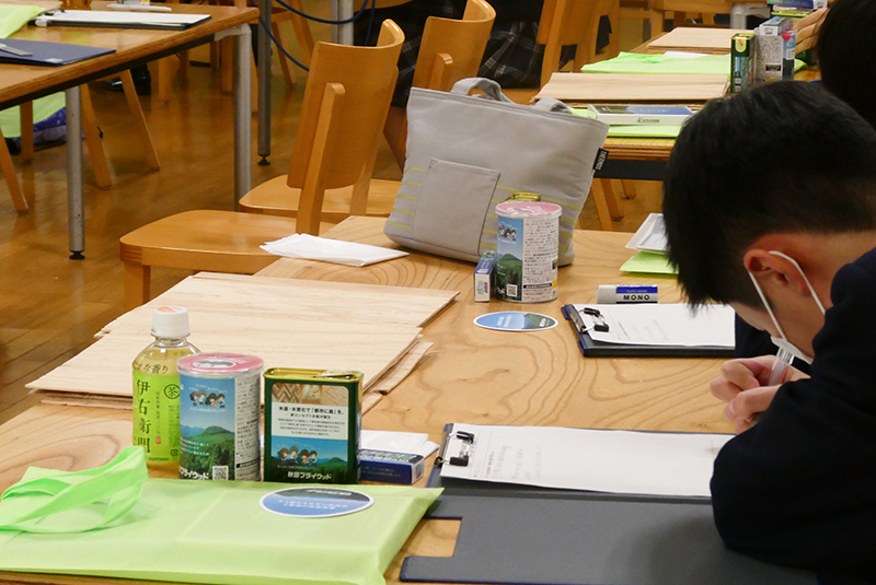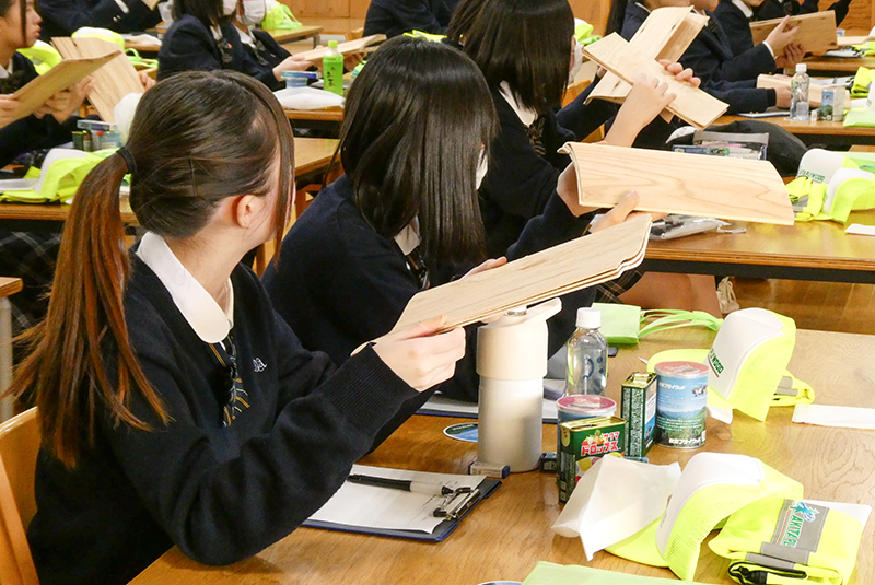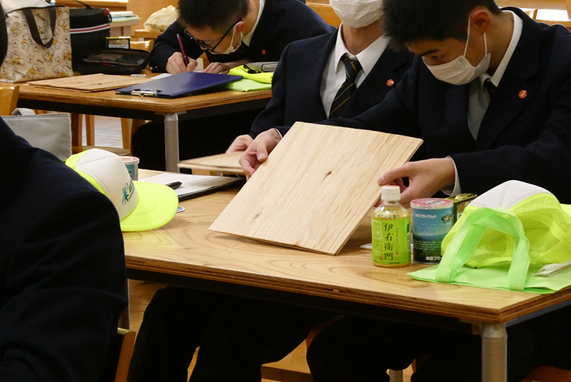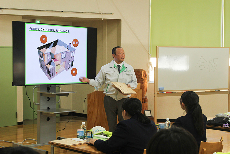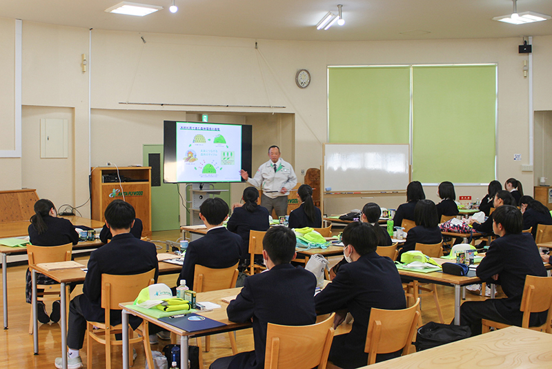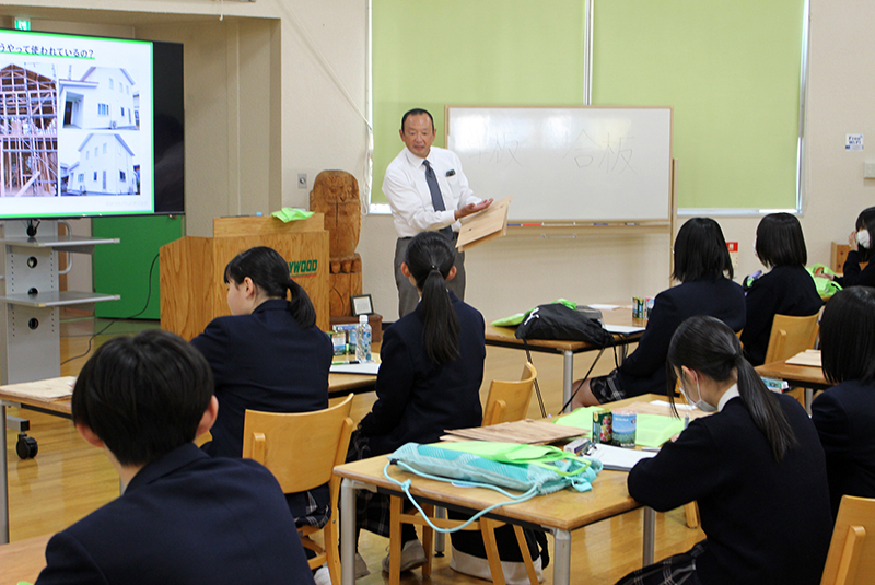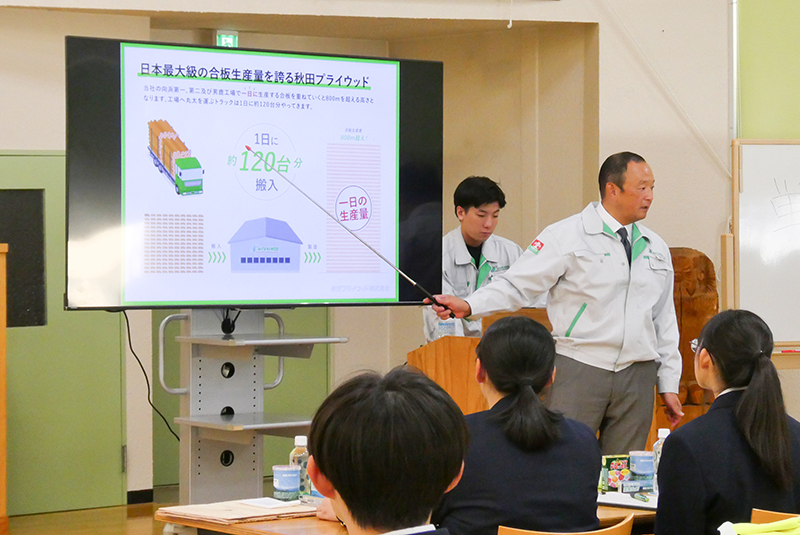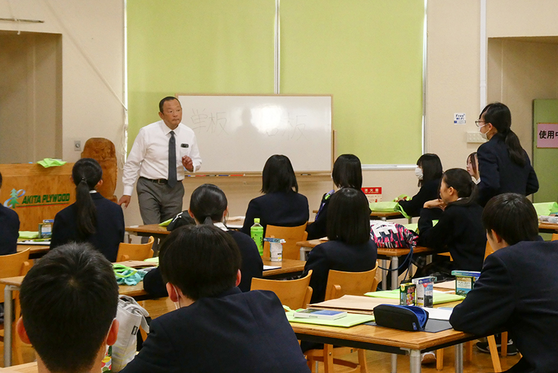 「木を伐って、使って、植えて、また使う」という森林資源の循環利用によって二酸化炭素の吸収を促進させることが地球温暖化の防止に貢献できることを説明し、事業を通じて取り組んでいる「緑の循環」の重要性を説きました。合板事業によって秋田の地で地球環境の保護に取り組んでいることを示して、秋田にはどのような会社があるのか、実際に働いている人たちはどういう志をもって仕事をしているのか等について知って欲しい、と生徒たちに伝えました。