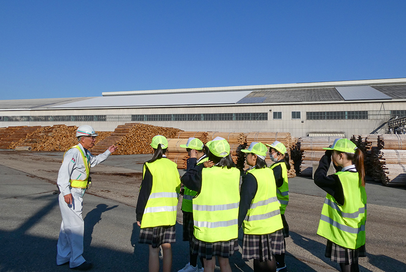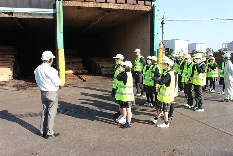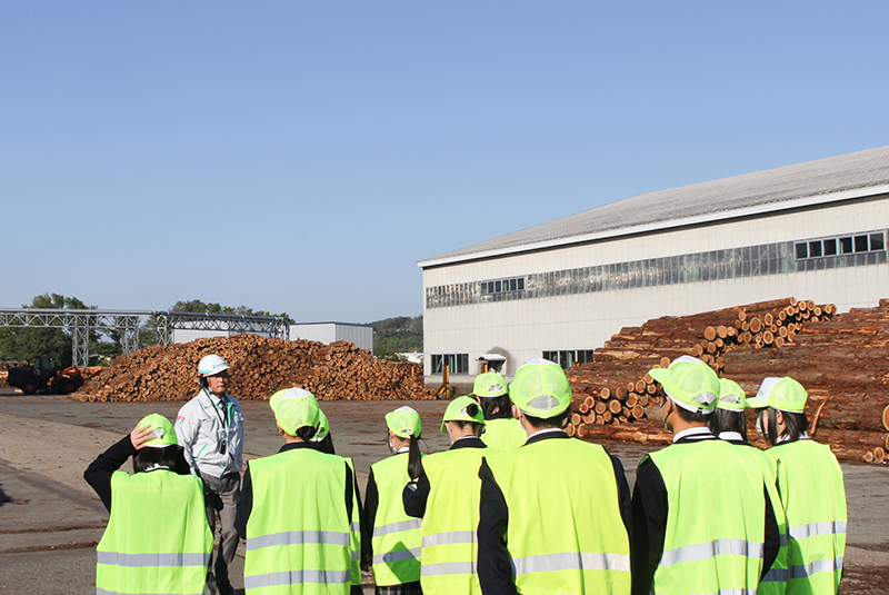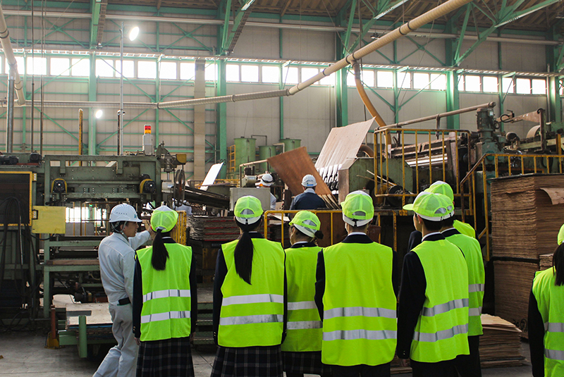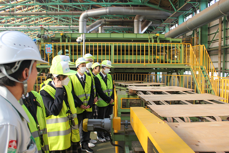 工場見学は3グループに分かれて各グループに当社社員が一人ずつ付き、各工程の説明をしながら行われました。第二工場の原木置き場からスタートした生徒たちは、初めて見る大量の原木を前に驚きの表情を見せながら説明に耳を傾けていました。工場内では丸太が「かつら剥き」されて単板になるロータリーレース、合板の含水率を下げるドライヤー、合板を圧着させるホットプレスなど機械の種類の多さと規模の大きさを目の当たりにした生徒たち。原木が合板になるまでには様々な工程で機械と人が関わっていることを学んでいました。