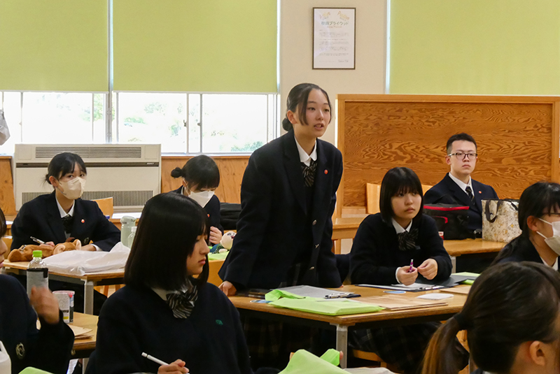 合板工場や育苗ハウスから戻った生徒からの質疑応答では「人口減少の中で毎年の採用人数は?」「工場内の作業工程で大事なことは?」「どんなことに誇りを持って仕事をしているか」などの質問が出されました。生徒たちからの真剣な質問に1つ1つ答えることで、当社のことをより理解してくれるよう務めました。