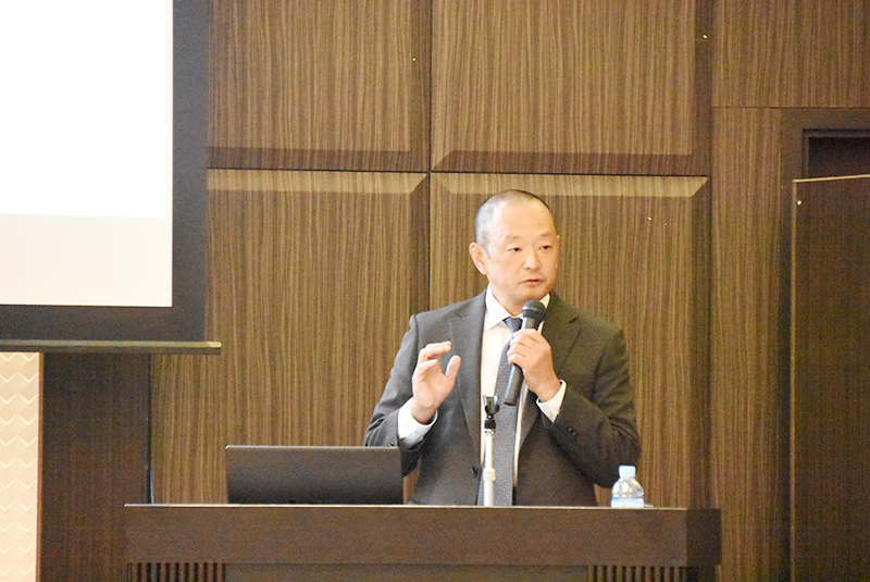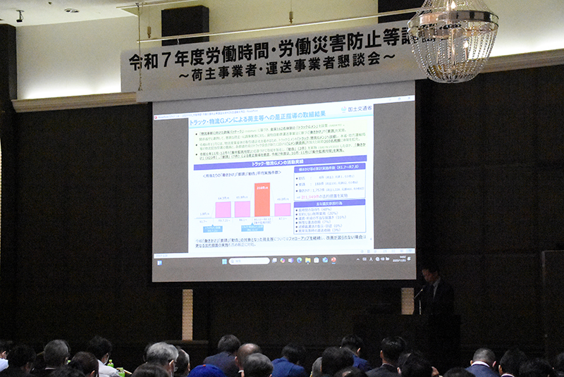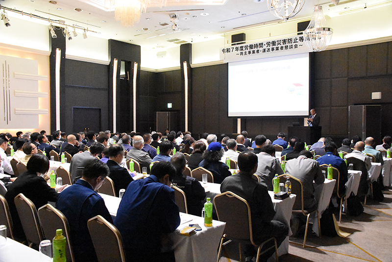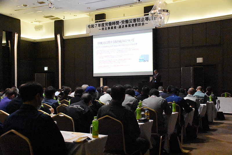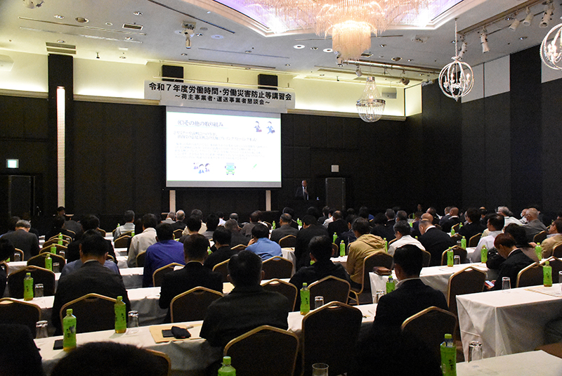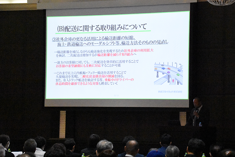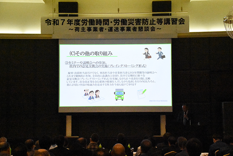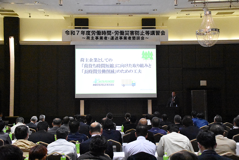 2025年11月5日、荷主事業者と道路貨物運送事業者が相互の理解を深めて長時間労働の削減などの労働環境等の改善を図るため、「令和7年度労働時間・労働災害防止等講習会(主催:秋田労働局)」がホテルメトロポリタン秋田で開催されました。国内に合板を流通させる荷主企業として登壇する機会を得て、金田憲明取締役総務経理部長が当社の荷待ち時間削減への取り組みを紹介しました。