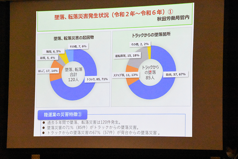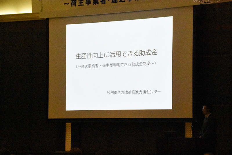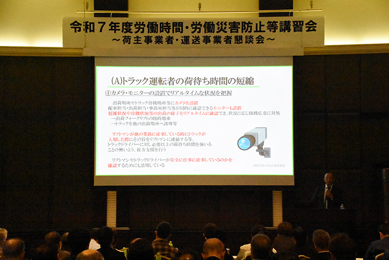 講習会は道路貨物運送事業者と荷主事業者を対象として秋田県北、県央、県南の3カ所で開催されます。行政の各施策の紹介では「長時間の恒常的な荷待ちの改善等について(本荘労働基準監督署)」「『トラック・物流Gメン』の取り組み等について(国土交通省東北運輸局秋田運輸支局)」「荷役作業等における労働災害防止について(秋田労働基準監督署)」「運送事業者・荷主が利用できる助成金制度(秋田働き方改革推進支援センター)」といった長時間労働の削減、作業中の事故防止に対する具体的な事例が説明されました。