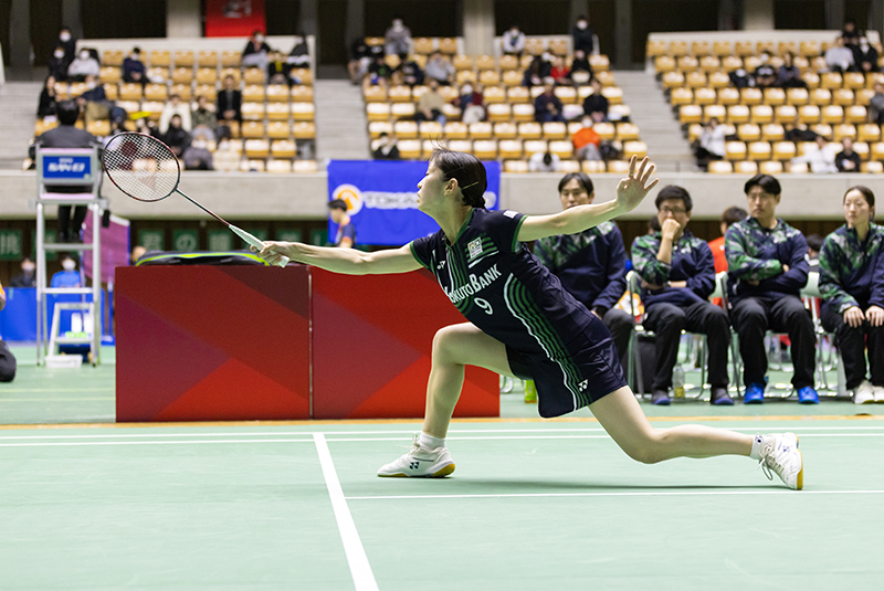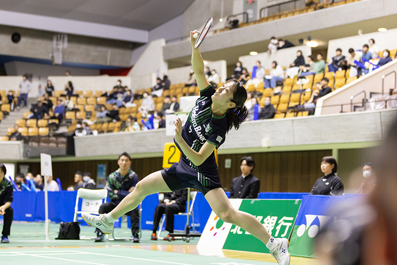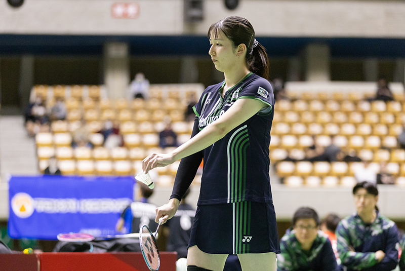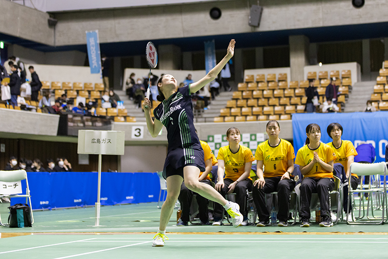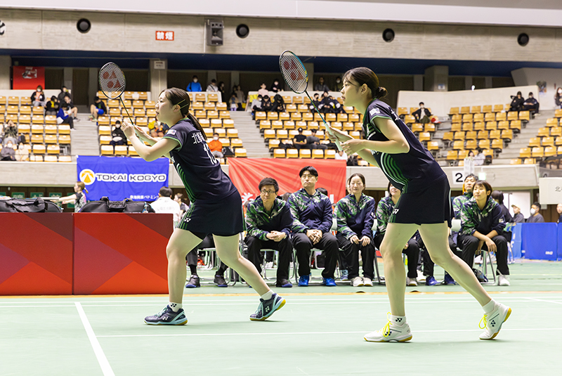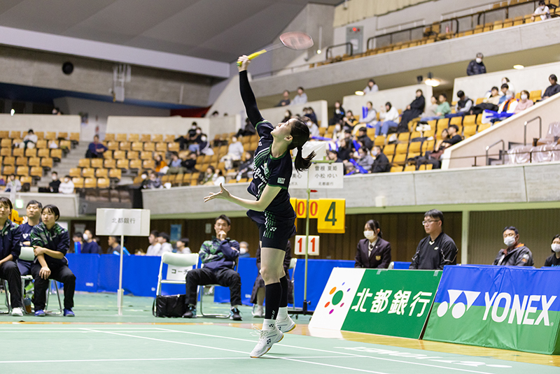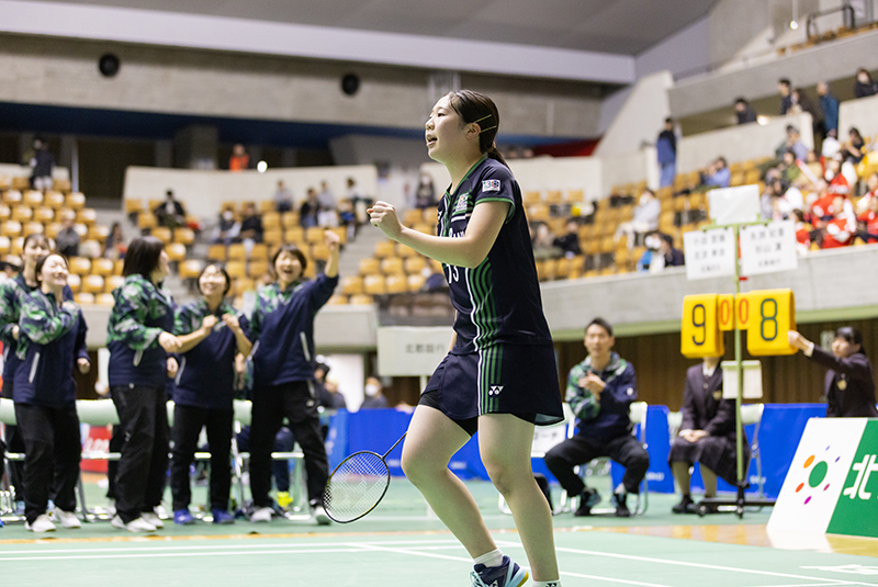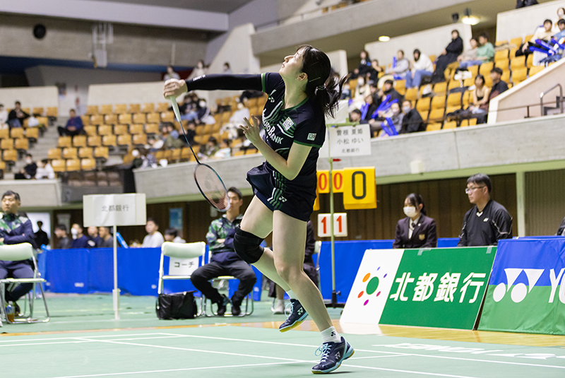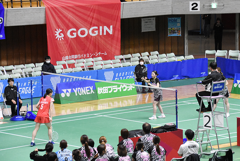 続く第3ゲームである「第2ダブルス」には、現在のチームのダブルスエースである曽根夏姫/小松ゆいペア(主将)が登場。第1セットは相手の攻撃に押され、ミスも重なり18−21と落としますが、第2セットは22−20と接戦をものにしました。勝負の第3セットは長身を活かした小松選手の強打と前衛での曽根選手の攻撃が上手く機能し、序盤から得点を積み重ねて21−11でゲームを制しました。チームを引っ張る曽根/小松ペアの逆転勝利で地元秋田のファンにこの試合の勝利を届けてくれました。