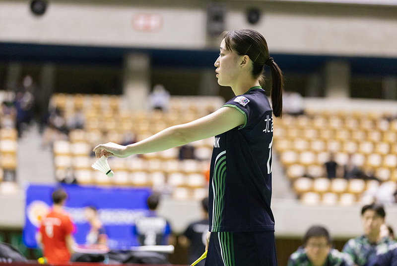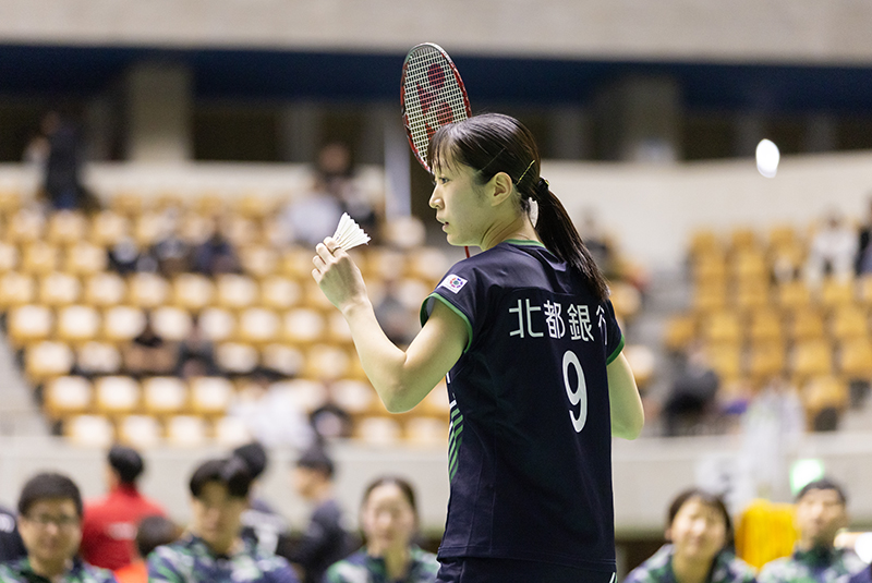 11月1日に始まった今シーズン、1勝1敗で迎えた北都銀行のこの日の対戦相手はここまで未勝利の広島ガス。地元秋田の声援を受けて負けられない秋田大会の第1ダブルスには永渕妃香/杉山凜ペアが登場しました。終始相手ペースでゲームが進み、12−21、8−21と第1ダブルスを落としてしまいました。続くシングルスは日本代表経験のある舛木さくら選手が21−11、21−12とゲーム全体を通じて優位に試合を進めてストレートで勝利を収め、ゲームカウント1-1でタイに戻します。