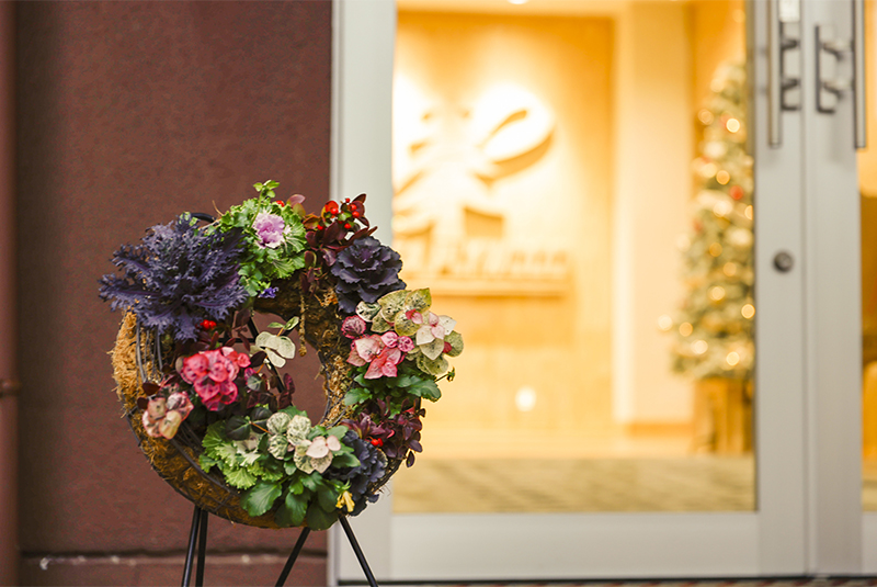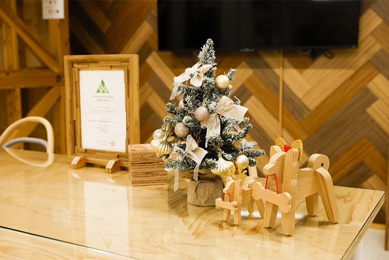 本社と向浜工場で当社オリジナルのクリスマスツリーが飾られて、この時期らしい華やかで温かな空間でお出迎えしています。クリスマスツリーの装飾を通じてお客様のお出迎えはもちろんのこと、社員がより気持ち良く働くための心地よい空間づくりに努めています。