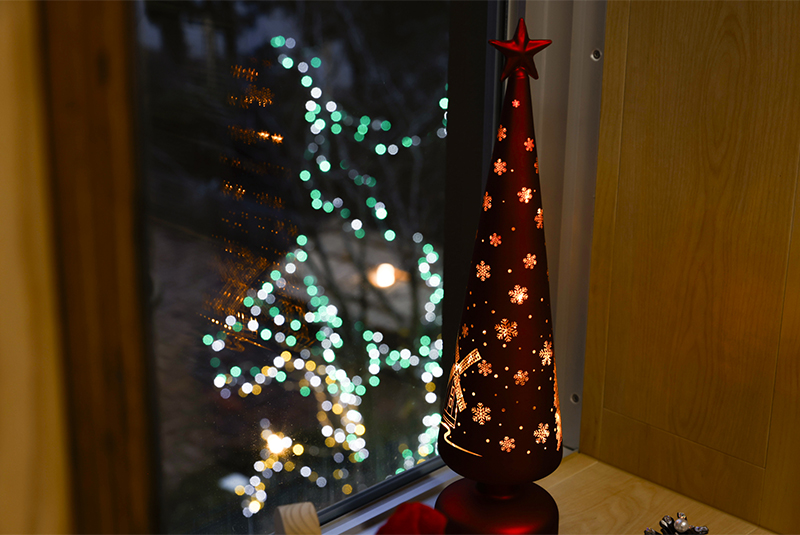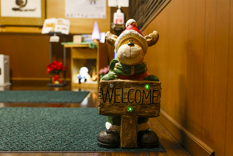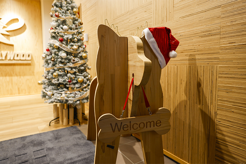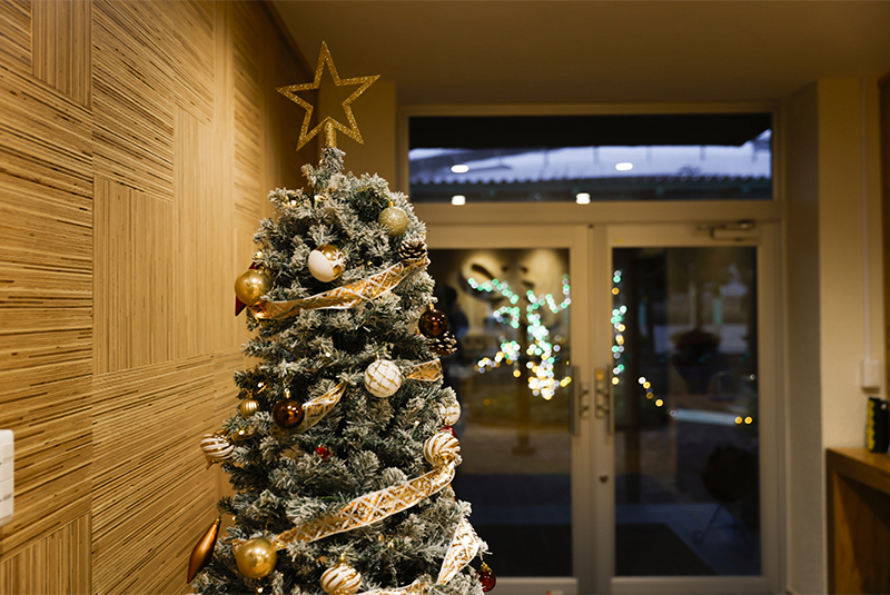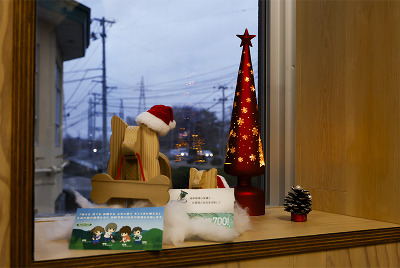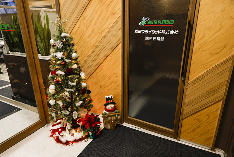ツリーやデコレーションは当社社員が一つひとつ丁寧にオーナメントなどの飾り付けを行いました。向浜工場厚生棟入口前のロウバイはLEDイルミネーションで装飾され、緑色のやさしくやわらかな光を明滅しています。厚生棟内の大会議室やミーティングルームにもサンタ帽を被る木製の秋田犬のオブジェやミニツリーが置かれ、季節を感じる空間となっています。