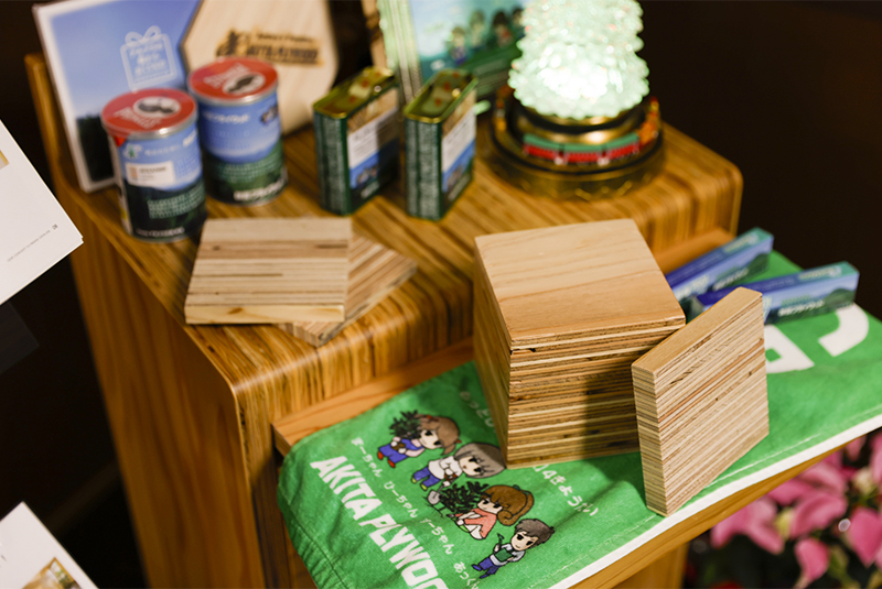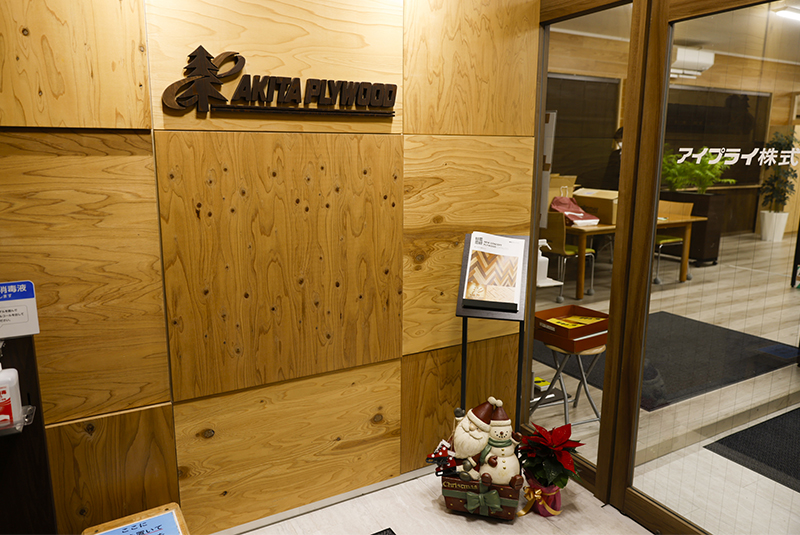 本社では1階入口前にツリーが設置されており、2階ではクリスマスカラーの一つでもある緑色をベースとした当社オリジナルお菓子やオリジナルマフラー、合板のカットサンプルを紹介する展示、当社オリジナルお菓子のミニツリーがお客様を出迎えています。