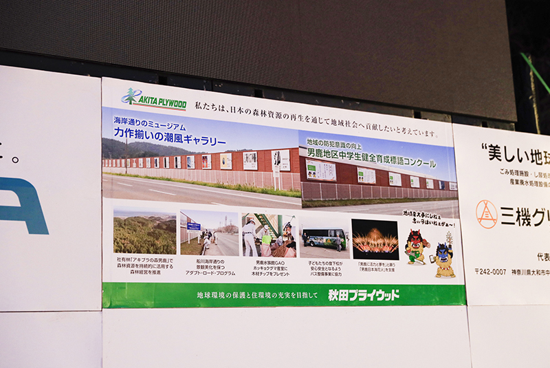まつりの開催を支える企業名を紹介する案内看板当社は男鹿で操業する企業として「なまはげ柴灯まつり」などの行事・イベント開催の支援を行うとともに、男鹿工場「潮風ギャラリー」で市内の小・中学生が描いた絵画や地域の防犯意識の向上を高める標語の展示、昨年12月に男鹿水族館GAOに5年ぶりとなるホッキョクグマの赤ちゃんを出産したホッキョクグマ「モモ」に産室づくりのための木材チップをプレゼントするなど地域を盛り上げるために様々な活動を行っています。