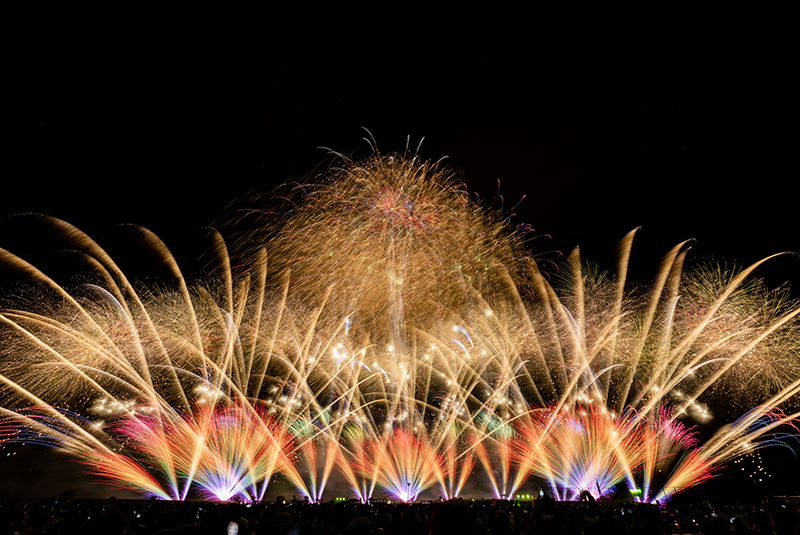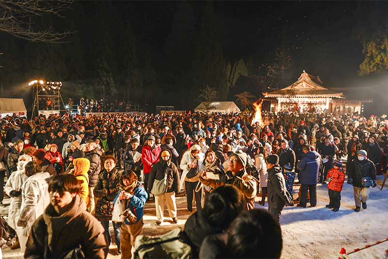 「男鹿に活力と夢を」と打ち上げられる男鹿日本海花火の開催を支援祭りの舞台となる真山神社は、山岳信仰の霊場として知られ、国家安泰、武運長久、五穀豊穣、海上安全の守護神として古くから地域の人々が祈りを捧げてきた由緒ある神社です。境内に焚かれる柴灯(松明)の炎は、神を迎える清めの火として神聖な雰囲気を創り出します。燃え盛る炎、雪景色、祝詞の響きが一体となった来訪神を迎え入れるための厳粛な儀式が非日常の世界へと来場者を誘い、なまはげ行事の根底にある信仰を体感させます。