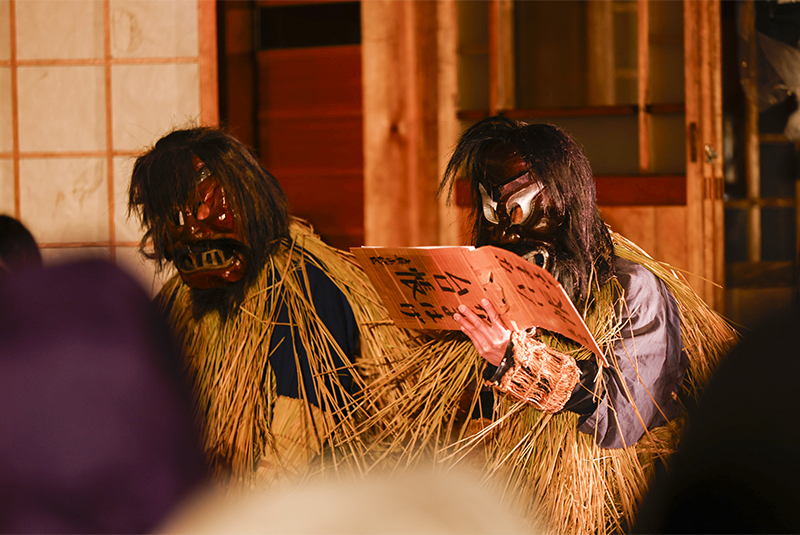 台帳を手に家々で訓示を残す「なまはげ行事再現」