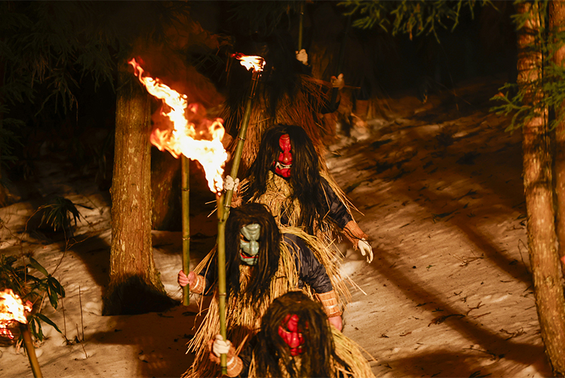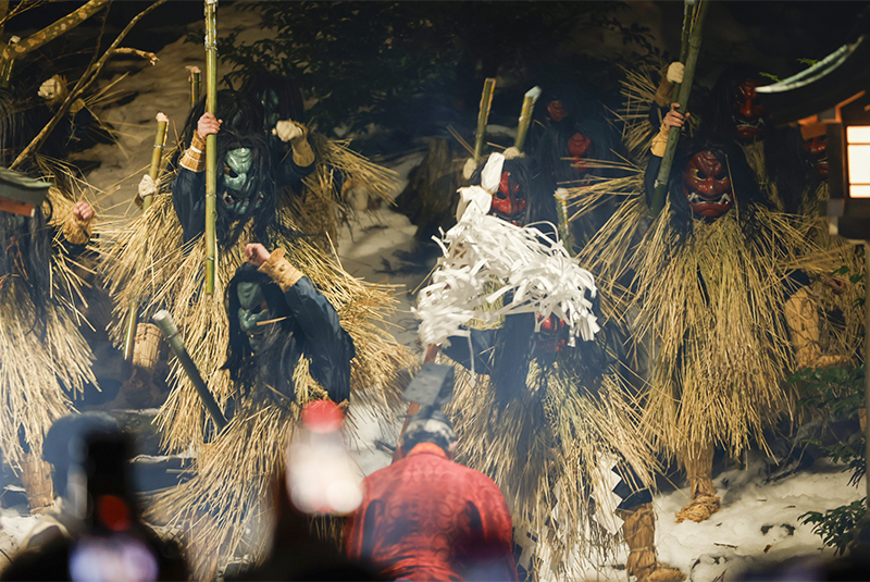 山から姿を現す「なまはげ下山」では、荒々しさの中にある威厳と来訪神としての神秘性、その勇壮な振る舞いや「ウォー!」という雄叫びを目の前に畏怖を感じざるを得ません。来場者は来訪神なまはげの存在感をあらためて強く感じた様子でした。