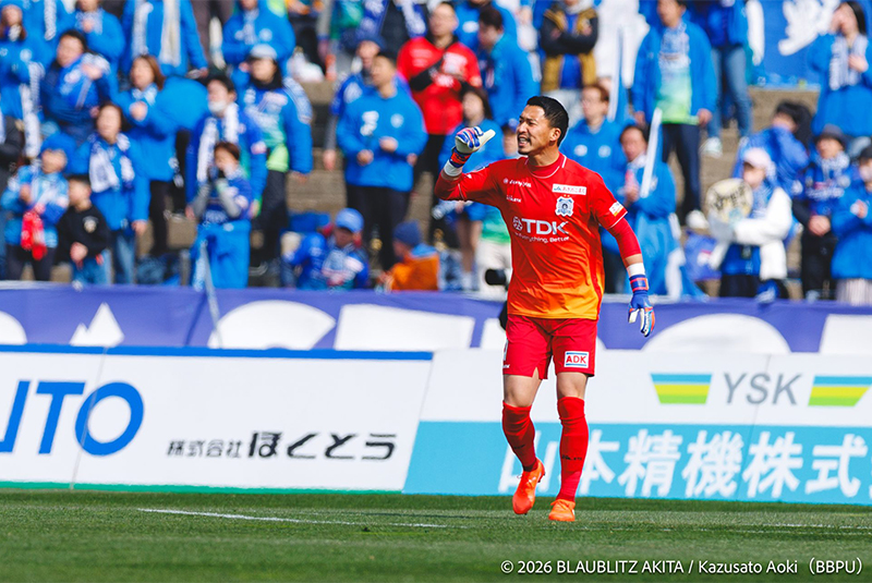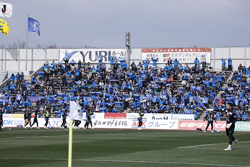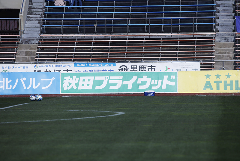 選手達の躍動を見守るピッチサイドバナー秋田は開始早々の前半6分にスローインからのこぼれ球をつなぎ、今シーズンから10番を背負うFW佐藤大樹選手がクロスを頭で合わせて先制点を挙げます。後半38分には後半34分で途中出場した秋田在籍9年目でチーム最年長35歳のMF9中村亮太選手がコーナーキックからのこぼれ球を決めて、貴重な追加点としました。セットプレーからのプレーで挙げた2点を守り切った秋田は、守備でも球際で強さを発揮し0に抑えて、秋田サポーターに2023年以来となるホーム開幕戦勝利を届けました。