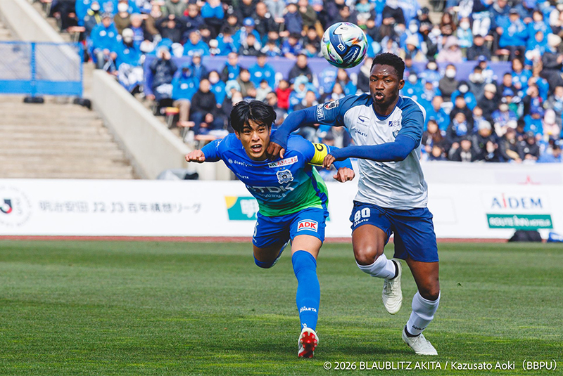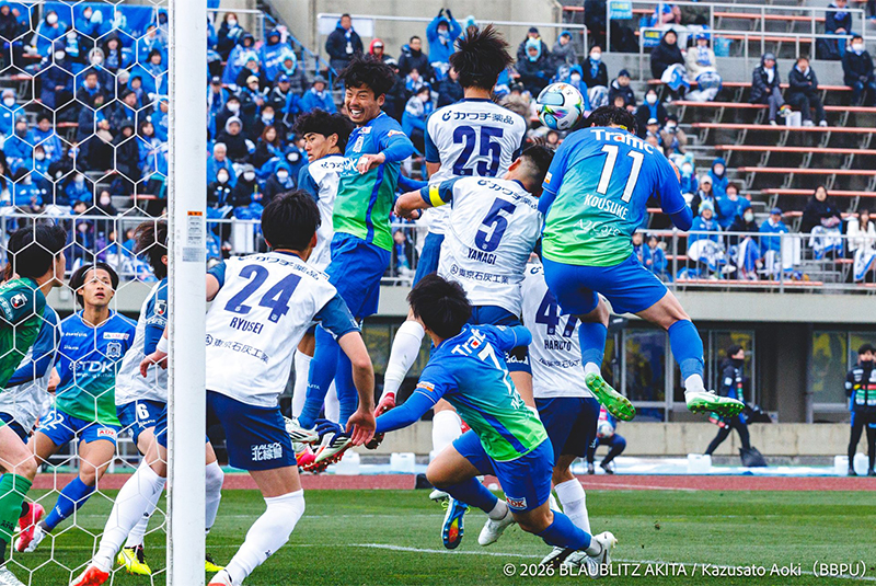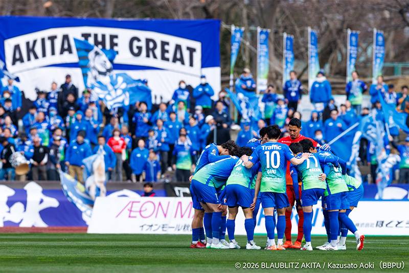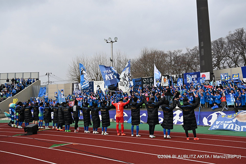 3月15日(日)、サッカーJ2「ブラウブリッツ秋田」はJ3「栃木SC」を迎えたホーム開幕戦を開催し、リーグ開幕からアウェイでの戦いを4勝1敗で終えて勢いに乗るチームを応援するため多くの秋田サポーターが集結。相手チームサポーターを含め5,718人がスタジアムに詰めかけ、寒さを吹き飛ばす勝利を後押しする熱い声援を送りました。