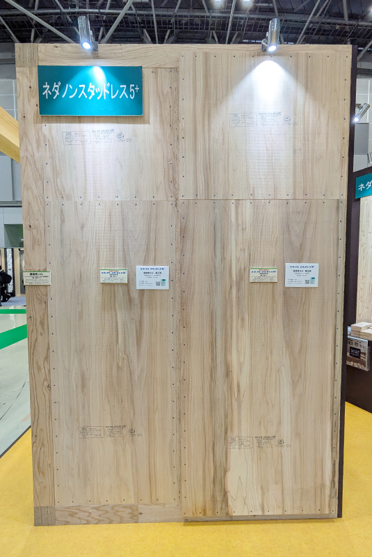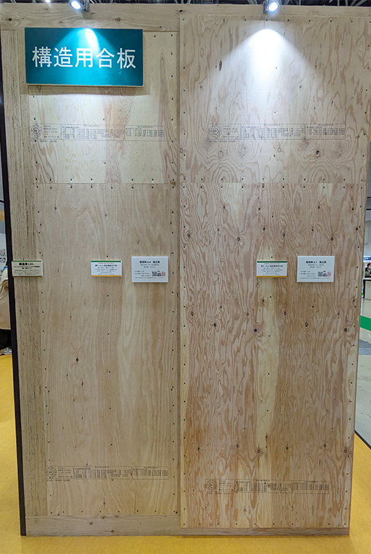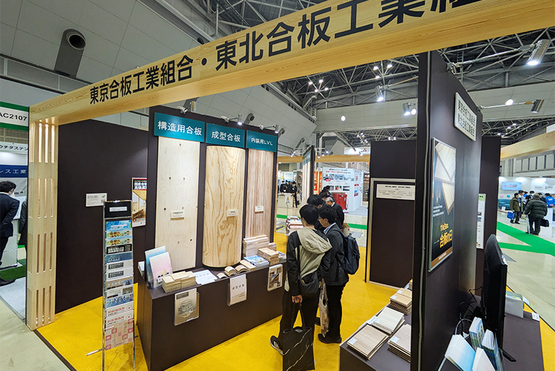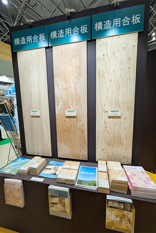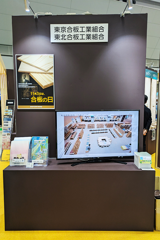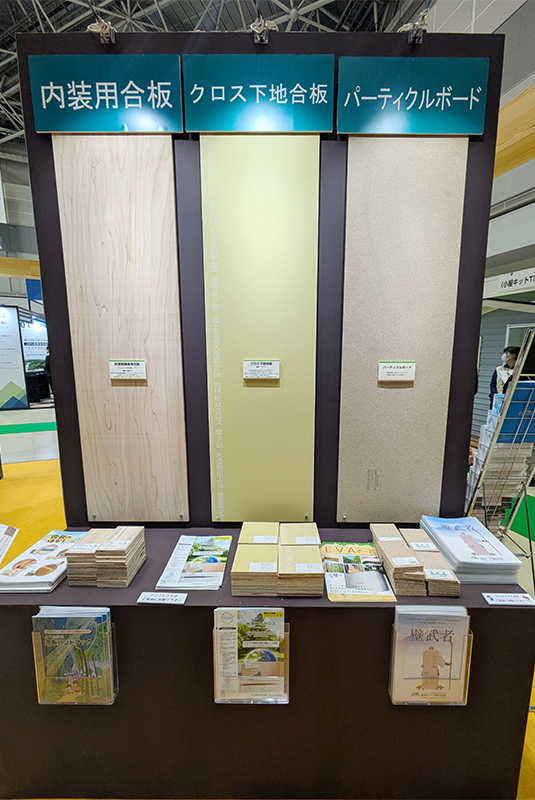 当社が所属する東北合板工業組合は東京合板工業組合と合同でブースを出展。地球温暖化の防止、健全な森林整備、木材産業の振興に貢献する国産材合板の利用促進が訴求され、組合に所属する各メーカーの構造用合板に加え、内装用無節合板や型枠合板、成形合板などの特殊合板、パーティクルボードやMクロスなどの製品展示が行われました。
