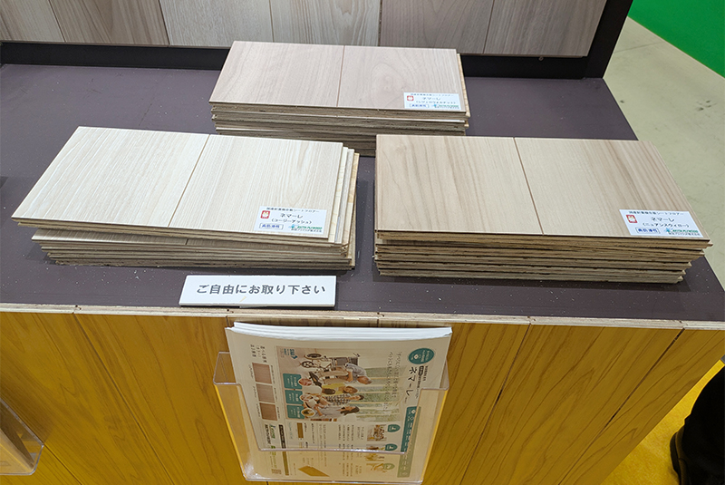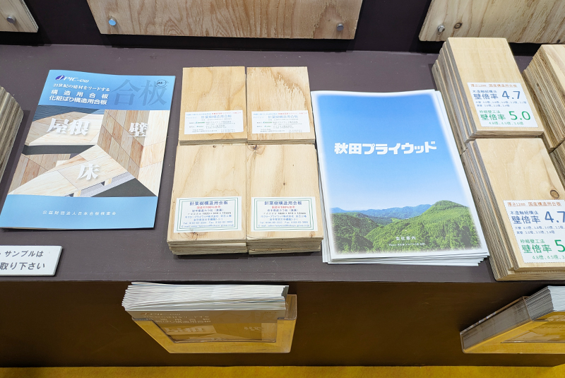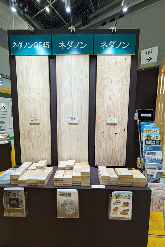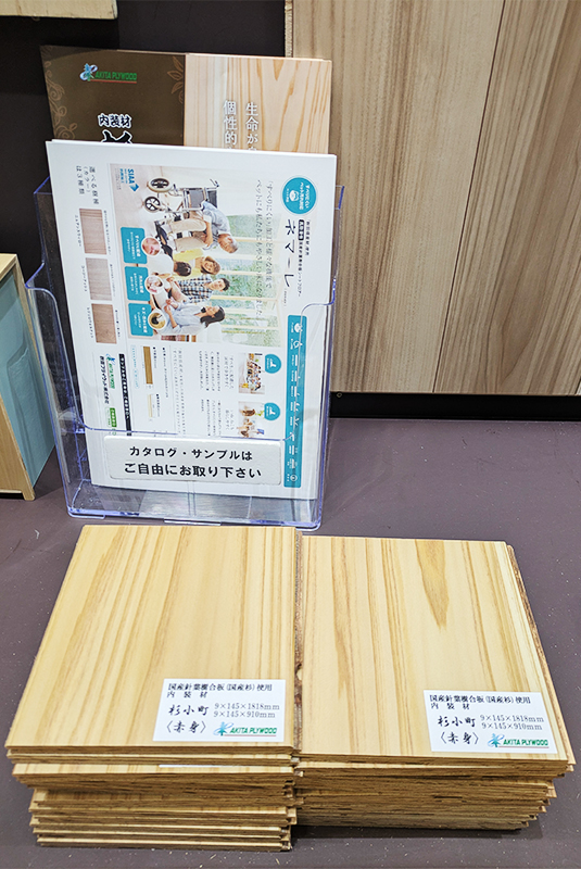 当社は構造用合板やネダノンスタッドレス5+、シートフロアー「ネマーレ」、内装材「杉小町」などのサンプルや会社案内、各種パンフレットを展示し、建築デザインや設計関係の方に製品を実際に見て触れて理解を深めていただきました。