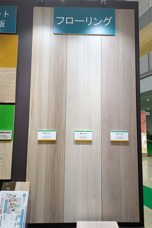 ブースを訪れた方々から杉小町やネマーレについて、台板に使っている樹種やカラーの種類などについて質問をいただき、ネマーレ防滑フロアの展示が珍しいためかブースに来た多くの方がサンプルやパンフレットを手に取っていました。