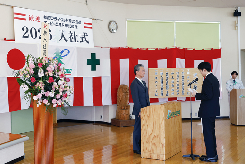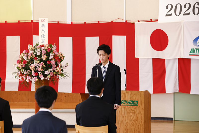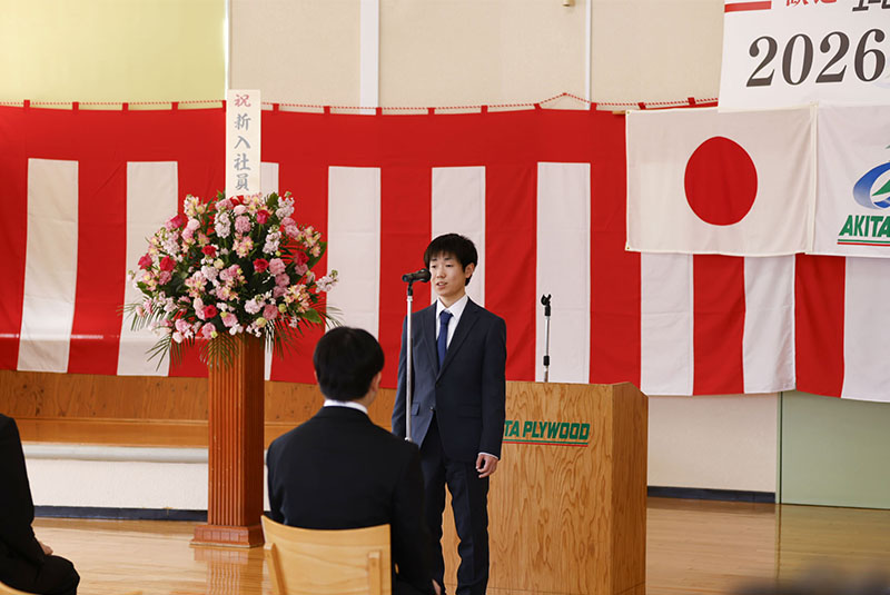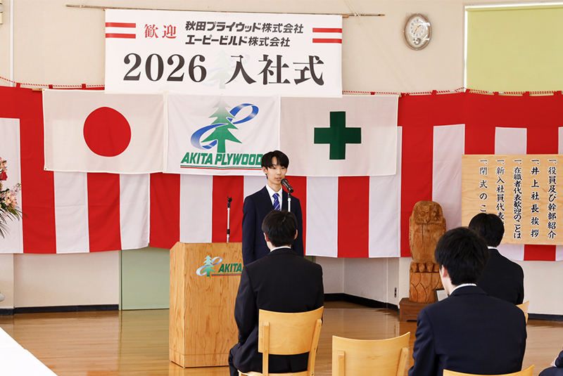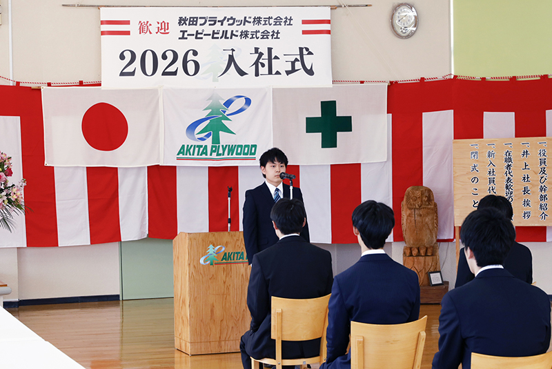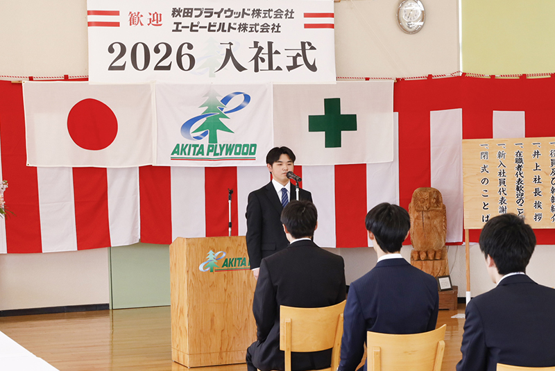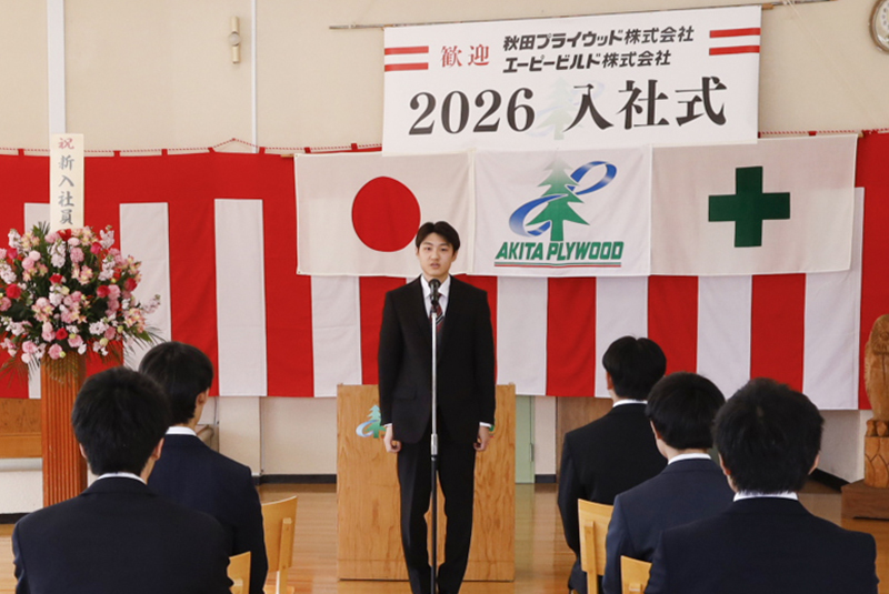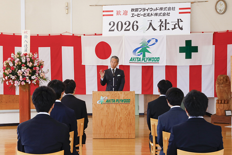 2026年3月27日、向浜第一工場厚生棟ホールにおいて入社式を執り行い、秋田プライウッド及びグループ各社に総勢6名の新入社員を迎えました。新入社員は社会人としての目標や抱負を述べて、井上篤博代表取締役社長をはじめ役員、グループ各社代表者からの歓迎や激励の言葉を受け、秋田プライウッドグループの一員として地域社会への貢献を果たいていく第一歩を踏み出しました。