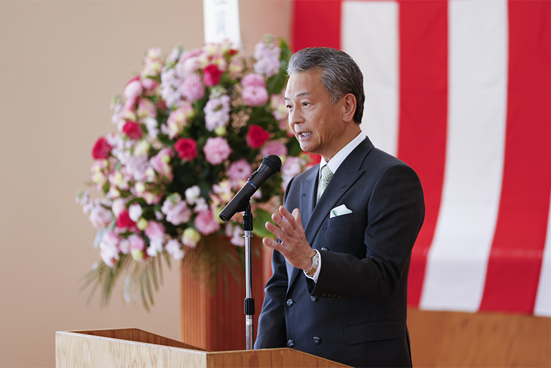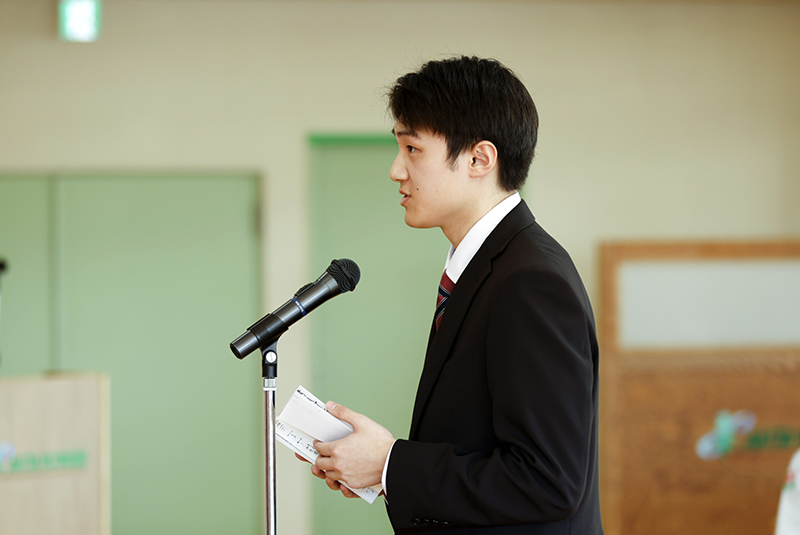 新入社員を代表して六平琉唯が謝辞のあいさつに立って、同期とともに入社の喜びと感謝を表すとともに、活動の経験で身に付けた粘り強さや継続する力、周囲と連携する姿勢を忘れず仕事に励んでいくと決意を新たにしました。