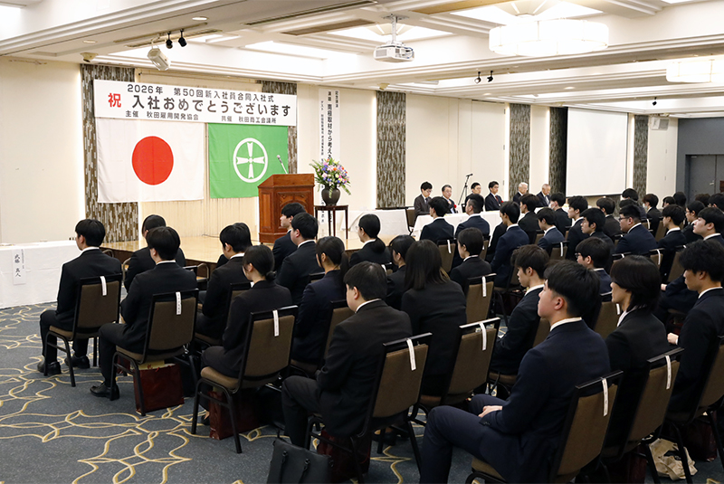 3月25日には「第50回新入社員合同入社式(主催:秋田雇用開発協会)」が秋田市のイヤタカを会場に開催されました。ハローワーク秋田管内の32事業所から、当社グループの新入社員6名も含めた総勢74名が参加し、秋田雇用開発協会の武藤会長や沼谷秋田市長からお祝いと激励の言葉が贈られ、これから新社会人として地元秋田に貢献していく決意を新たにしました。