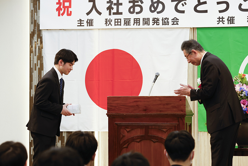 秋田雇用開発協会、秋田市、秋田商工会議所からそれぞれ新入社員に対する記念品が贈呈され、新入社員74名を代表して当社の東海林雄亮が登壇し、秋田雇用開発協会武藤会長から記念品の贈呈を受けました。