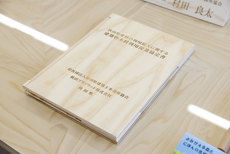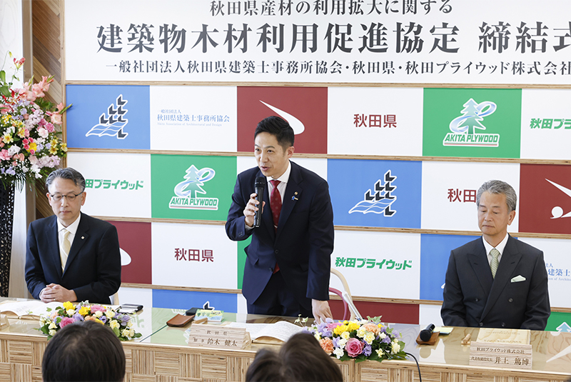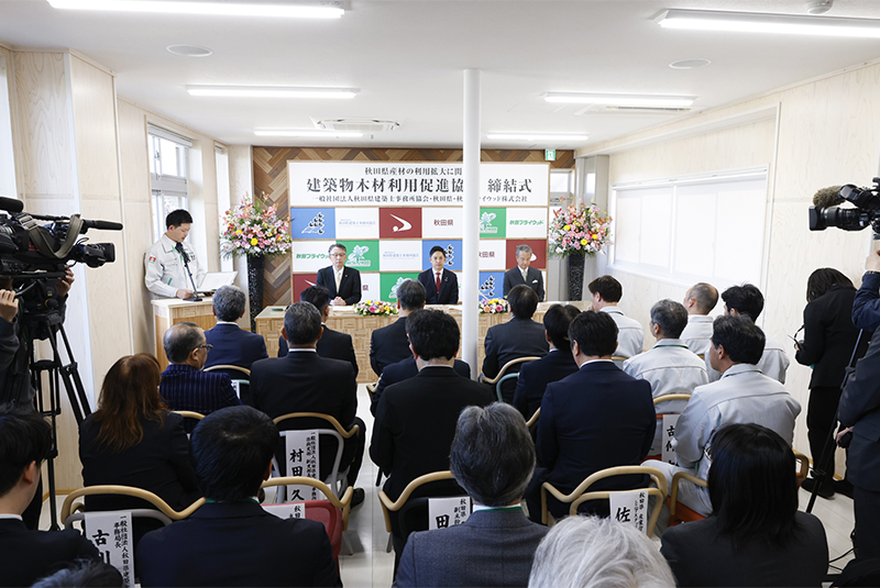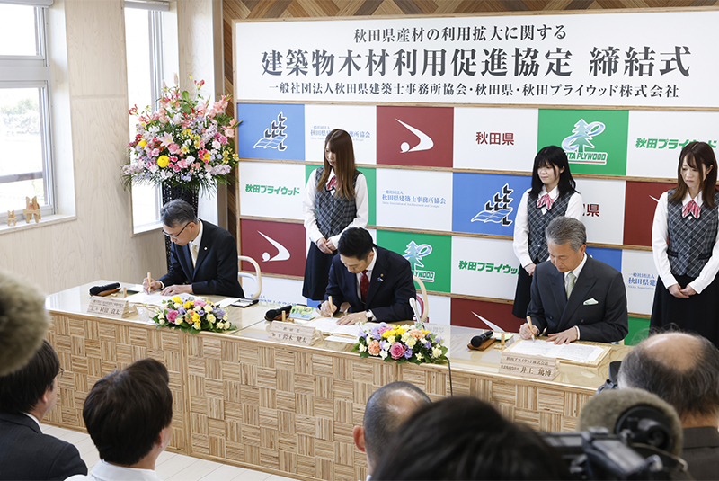 2026年3月27日、当社は秋田県内の建築物における秋田県産材合板の積極的な活用や木造技術者の育成、再造林の推進等に取り組むことを目的に一般社団法人秋田県建築士事務所協会、秋田県と「秋田県産材の利用拡大に関する建築物木材利用促進協定」を締結しました。