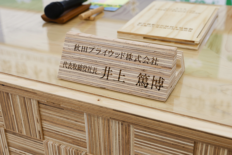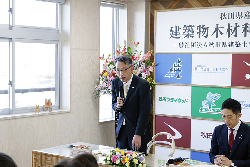 最後に井上社長が「戦後の拡大造林政策の下で植林された人工林が、現在では伐採適齢期を迎え十分に活用できるところまで育ったものの、日本の木材自給率は4割強に留まっている。秋田のスギを使って、秋田からいかに木材自給率を高めていくかに全力をあげて頑張っていきたい。住宅需要の減少が見込まれる中、店舗やオフィスの内装に木を多用し木質化することで二酸化炭素の排出を抑制でき、【都市に森】を増やすという価値を届けることができる。そのために建築士事務所協会や秋田県の皆様のご協力を仰ぎながら当社の合板や秋田県産材を使った製品を活用していただくことが必要。当社は全力をあげて秋田県の森林資源を有効活用して良い製品をお届けしたい」と今後に向けた決意を新たにしました。