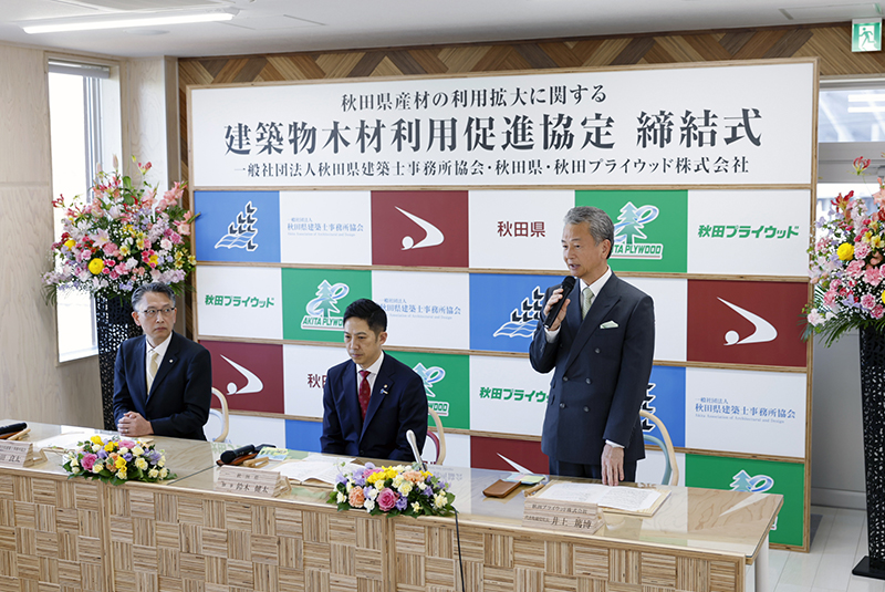 締結式は当社向浜工場厚生棟3階大会議室で行われ、秋田県建築士事務所協会、秋田県、当社の関係者、報道各社が出席のもと、村田良太秋田県建築士事務所協会会長、鈴木健太秋田県知事、井上篤博代表取締役社長が協定書に署名し三者の協定が結ばれました。